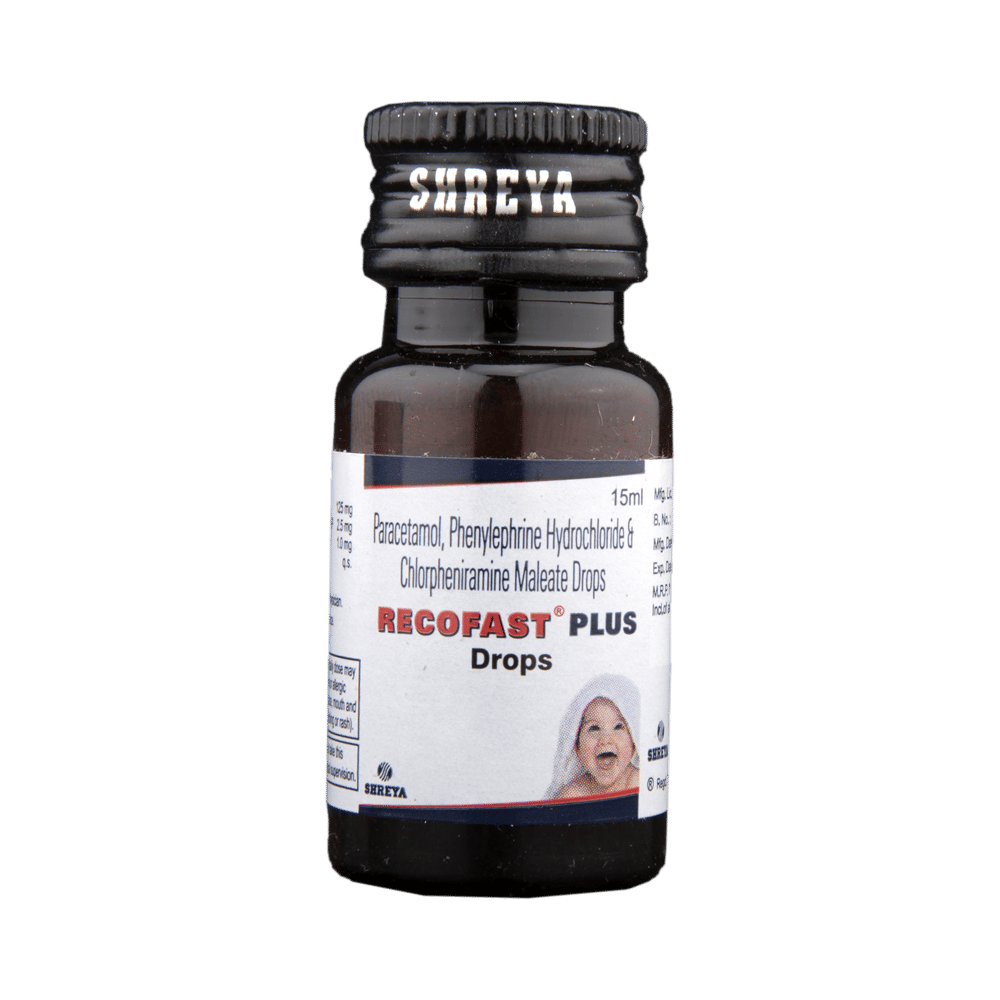 Recofast Plus Drop is commonly prescribed in children to treat common cold symptoms like sore throat, runny nose, cough, sneezing, watery eyes, body ache, and fever. Give Recofast Plus Drop to your child by mouth with or without food. Children often have a sensitive stomach and complain of stomach upset while taking medicines. Prefer giving this medicine with food if this happens. Always remember that the dosing schedule provided by your child’s doctor depends on the type of symptoms your child has, so make sure to follow the prescribed dose, time, and way strictly.Give Recofast Plus Drop at a fixed time each day so that it gradually makes a place in your child’s daily routine, which will help you to remember. If your child vomits within 30 minutes of taking this medicine give the same dose again. However, never repeat the dose if it's already time for the next dose. Your child may start to feel better within a week of regular dosing. However, you must continue giving the medicine to your child to finish the complete prescribed course as stopping it abruptly may worsen your child’s condition.Some of the minor and temporary side effects that your child may experience while taking this medicine include vomiting, diarrhea, nausea, dizziness, rash, and headache. Usually, these episodes subside once your child’s body adapts to the medicine. In case these side effects persist or become bothersome for your child, consult your child’s doctor without any delay.Narrate your child’s complete medical history to your child’s doctor, including any ongoing medicine regime or history of any allergy, heart problem, blood disorder, birth defects, airway obstruction, lung anomaly, skin disorder, liver impairment, and kidney malfunction. This information is critical for dose alterations and for planning your child’s overall treatment.