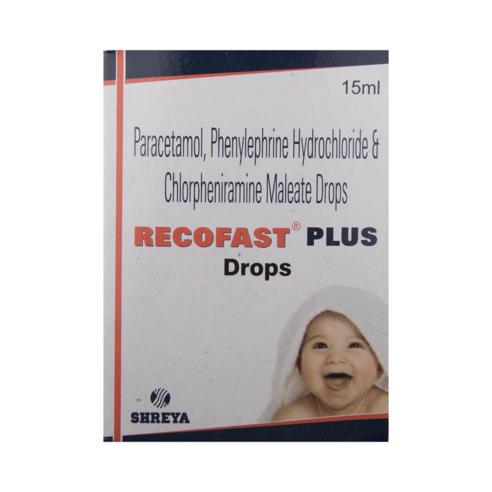 Recofast Plus Drop is a combination of three medicines: Chlorpheniramine, paracetamol, and phenylephrine which relieves common cold symptoms. Chlorpheniramine is an antiallergic that relieves allergy symptoms like runny nose, watery eyes, and sneezing. Paracetamol is an analgesic (pain reliever) and antipyretic (fever reducer). It blocks the release of certain chemical messengers in the brain that are responsible for pain and fever. Phenylephrine is a nasal decongestant that narrows the small blood vessels providing relief from congestion or stuffiness in the nose.