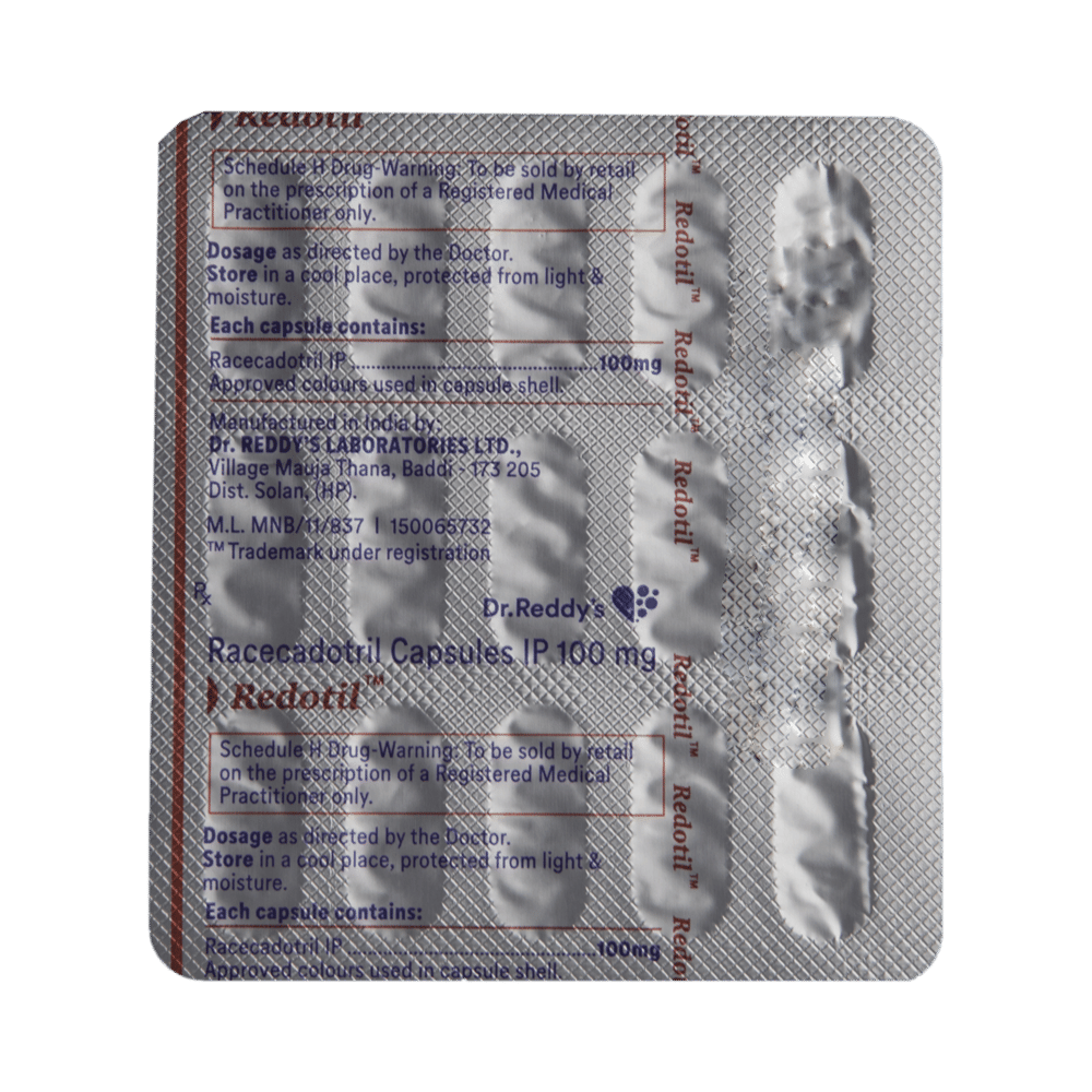 Redotil 100mg Capsule has an anti-secretory effect. It reduces the secretion of water and electrolytes from the intestine. This helps to reduce the amount of fluid loss from the body in diarrhoea.