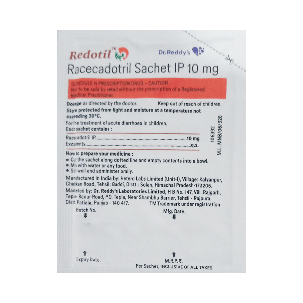 Redotil Sachet Pineapple is a commonly prescribed medicine for the symptomatic treatment of acute diarrhea in infants and children. This medicine is usually given when diarrhea cannot be treated effectively with fluids and dietary measures. It reduces the amount of water and salts that are lost in the stools. Give Redotil Sachet Pineapple to your child orally either before or after food, preferably in addition to ORS (oral rehydration solution). Usually, it is given three times a day, but this dose will vary depending upon the child's body weight and age. If your child vomits within 30 minutes of taking Redotil Sachet Pineapple, repeat the same dose once your child feels better. Along with taking this medicine, your child needs to drink plenty of fluids and eat a healthy balanced diet.This medicine may cause some minor and short-term side effects such as headache, skin rash, fever, respiratory disorder, and constipation. These episodes are temporary and subside on their own once the child’s body adapts to the medicine. However, in case they persist for long or start bothering your child, you must consult your child’s doctor without any delay.Your child’s doctor must be aware if your child has ever had any previous episode of allergy, bowel obstruction, electrolyte imbalance, liver impairment, and kidney malfunction. This will guide the doctor in planning your child’s overall treatment.
