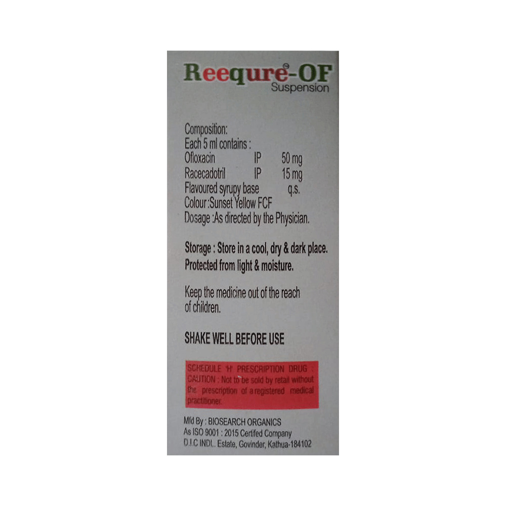 Reequre-OF Oral Suspension contains two medicines: Racecadotril and ofloxacin. Racecadotril is an enkephalinase inhibitor that has anti-secretory effects. This means that this medicine reduces the secretion of water and electrolytes from the intestine. As a result, the amount of fluid lost from the body in diarrhea reduces. On the other hand, Ofloxacin is an antibiotic. It kills bacteria by preventing them from reproducing and causing infection.