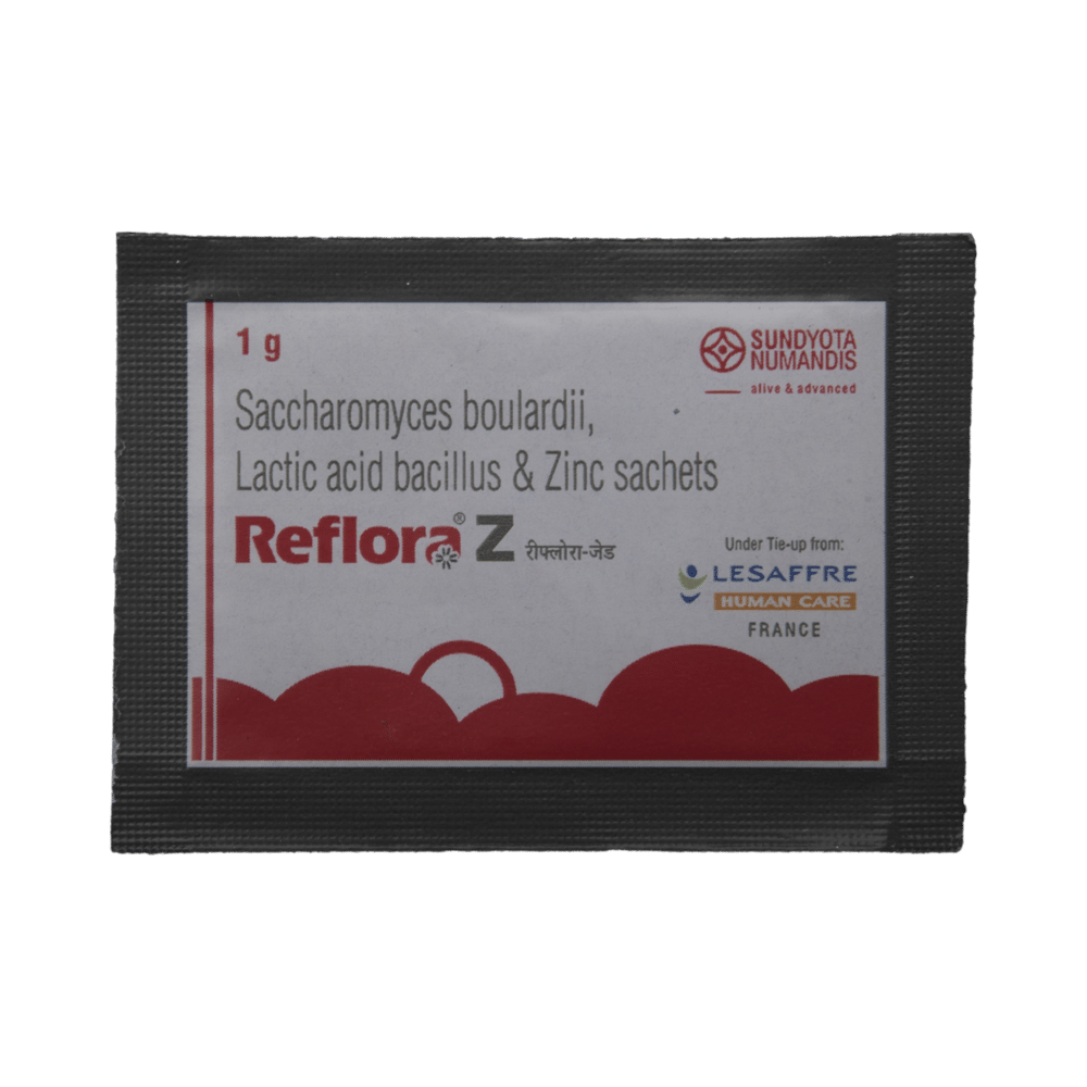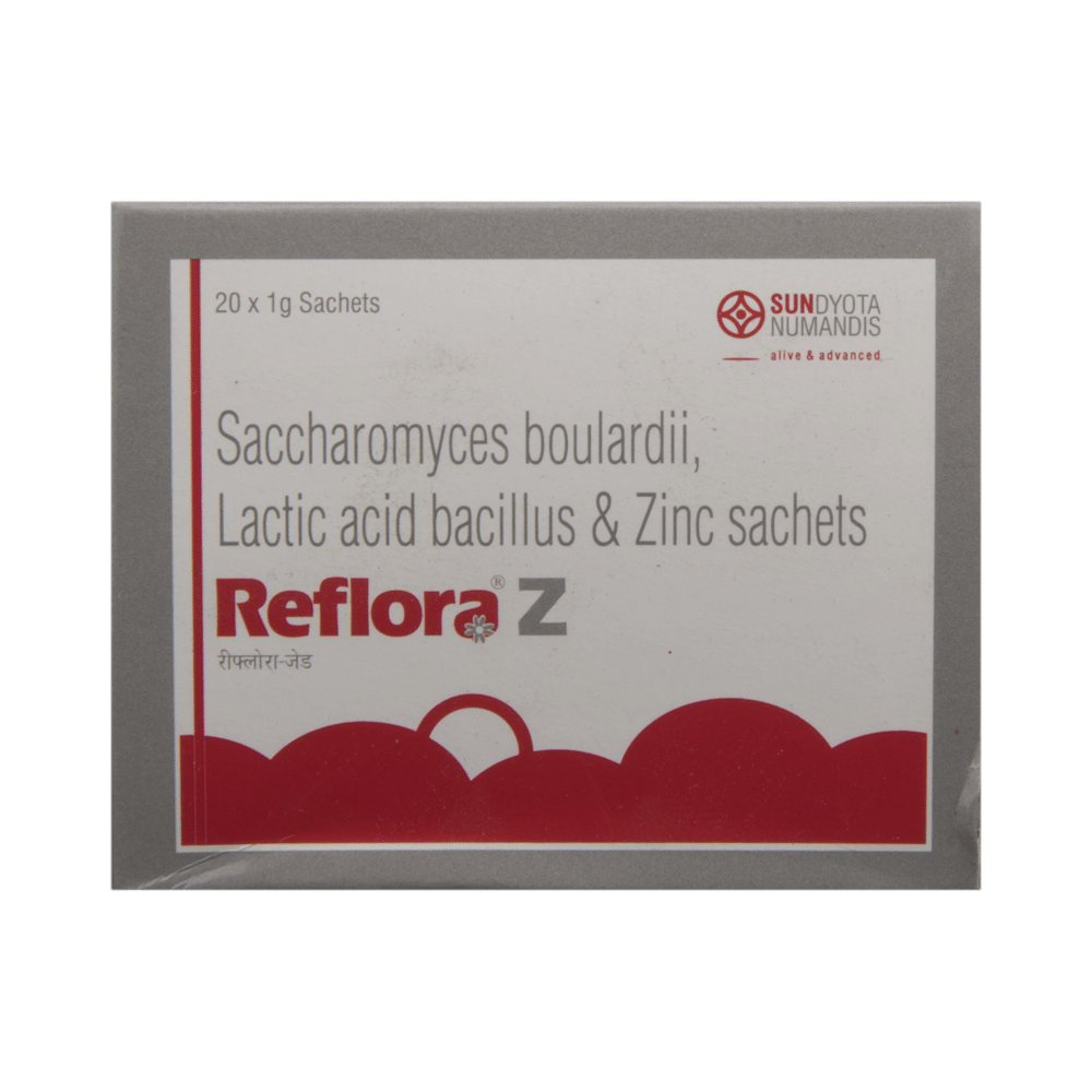 Reflora Z Sachet is a medicine used to treat infectious diarrhea. It restores a healthy balance of gut bacteria, enhances the natural defense mechanisms of the gut, and maintains the integrity of the gut lining. These actions reduce the severity and duration of diarrhea and speed up the healing process. Reflora Z Sachet may be taken with or without food. However, take it regularly and at a fixed time to ensure better efficacy. Also, do not consume it in more than the recommended dose, as this may have harmful effects on your body. If you miss a dose, take it as soon as you remember, and complete the prescribed dosage even if you feel better. The medicine should be swallowed as a whole; hence, do not chew or crush it. Common side effects of Reflora Z Sachet include bloating, nausea, vomiting, mouth sores, and diarrhea. They are usually mild and go away in time. However, if any of the side effects get worse or do not go away, consult a doctor. Before taking this medicine, let your doctor know about all the medications or supplements that you might be taking. Also, avoid taking the medicine if you have a known history of allergic reactions to any of the ingredients of this medicine. Pregnant or breastfeeding women are advised to consult their doctors before taking this combination medicine.