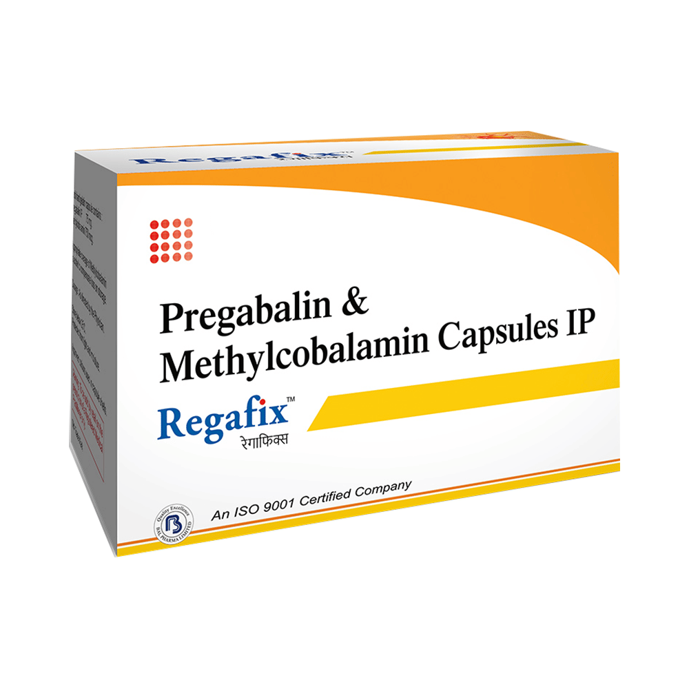 Regafix 750mcg/75mg Capsule is a combination of two medicines: Methylcobalamin and Pregabalin. Methylcobalamin is a form of vitamin B, which helps in the production of myelin, a substance that protects nerve fibers and rejuvenates damaged nerve cells. Pregabalin is an alpha-2 delta ligand that decreases pain by modulating the calcium channel activity of the nerve cells. Together, they relieve neuropathic pain (pain from damaged nerves).