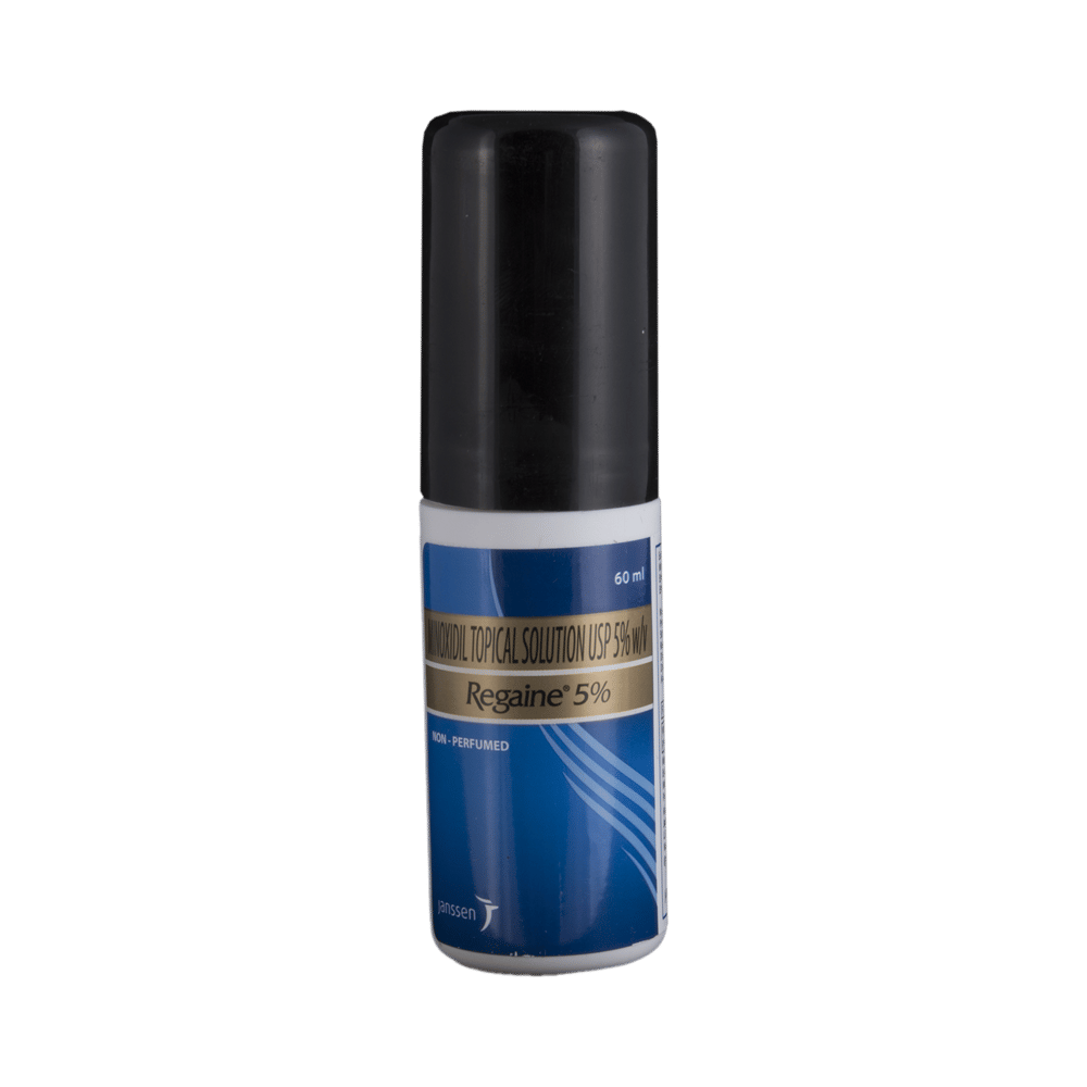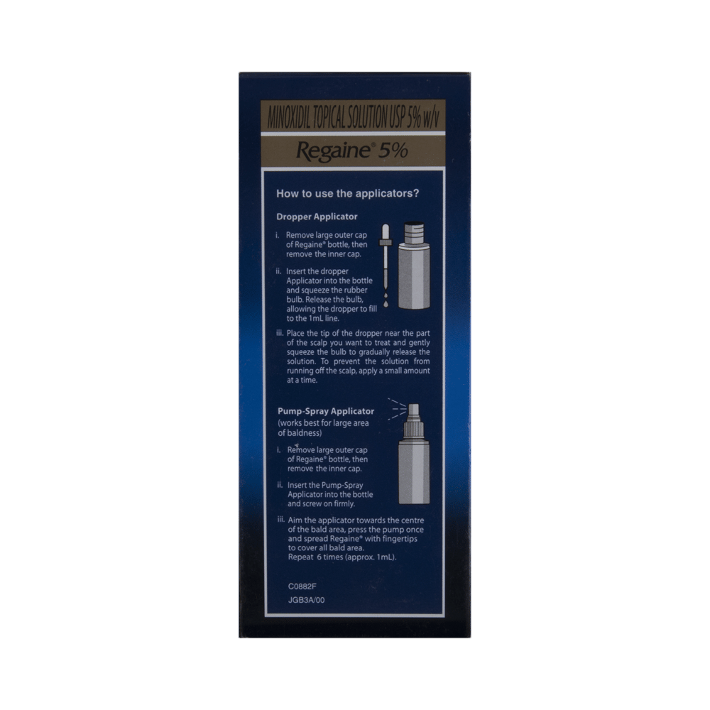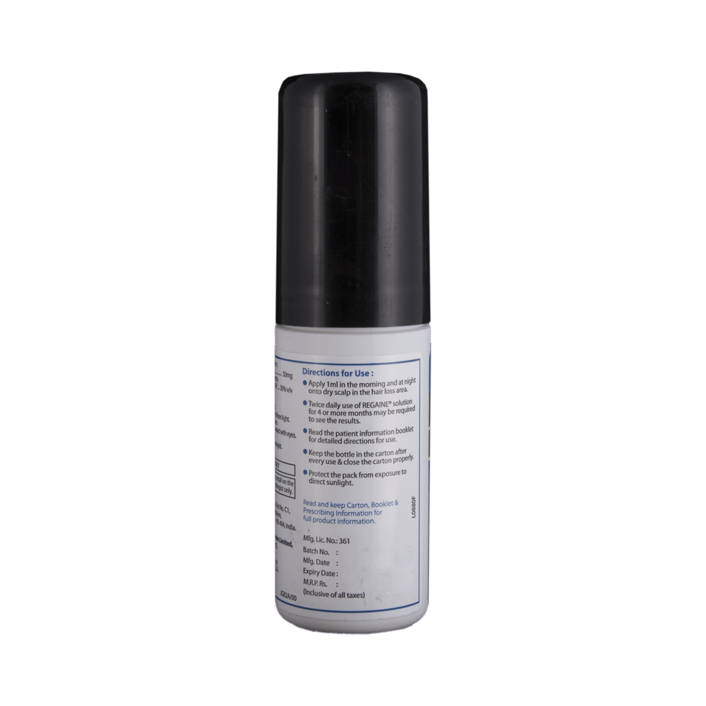 In Treatment of Hair lossRegaine 5% Solution is a medicine used to treat common hereditary hair loss. It can prevent further hair loss and help hair to regrow. It works by increasing blood flow to the hair follicles on your scalp, which prevents hair cell death and also enhances new hair growth. It is most effective for baldness or thinning at the top of the scalp, but less effective at the front or for receding hairline.Benefits are less likely if you have been bald for many years or have a large area of hair loss. Regaine 5% Solution is not suitable for sudden or unexplained hair loss. It is considered a safe medicine. There are separate products for men and women, and you should follow your doctor’s instructions carefully while using Regaine 5% Solution. Regrowth of hair improves your appearance, boosts your confidence, and enhances your social life. Use it regularly to maintain hair growth and to get the maximum benefits. Consult your doctor if you notice any changes in the hair growth while using Regaine 5% Solution.