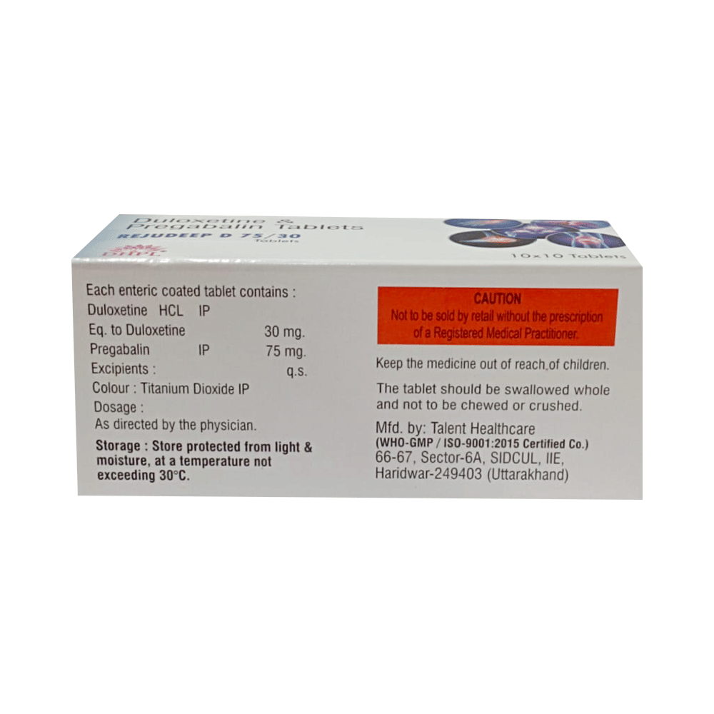 Rejudeep D 75/30 Tablet is used for the treatment of neuropathic pain. It decreases pain by controlling calcium channel activity of the nerve cells. It also increases the level of chemical messengers in the brain that helps maintain mental balance and stop the movement of pain signals in the brain. Rejudeep D 75/30 Tablet can be taken with or without food. However, it is advised to take it at the same time each day as this helps to maintain a consistent level of medicine in the body. Take this medicine in the dose and duration advised by your doctor as this is habit forming medicine. If you miss a dose of this medicine, take it as soon as you remember. Finish the full course of the treatment even if you feel better. It is important not to stop taking this medicine suddenly as it may worsen your symptoms.Some common side effects of this medicine include peripheral edema, nausea, headache, dryness of mouth, difficulty in concentration and blurred vision. It may cause dizziness and sleepiness, so do not drive or do anything that requires mental focus until you know how this medicine affects you. This medicine may cause weight gain and to control it, you should have a balanced diet and exercise regularly. It is important to inform your doctor if you develop any unusual changes in mood or behavior, new or worsening depression, or suicidal thoughts.Before taking this medicine let your doctor know if you suffer from kidney or liver disease. Your doctor should also know about all other medicines you are taking as many of these may make this medicine less effective or change the way it works. Inform your doctor if you are pregnant, planning pregnancy or breastfeeding.
