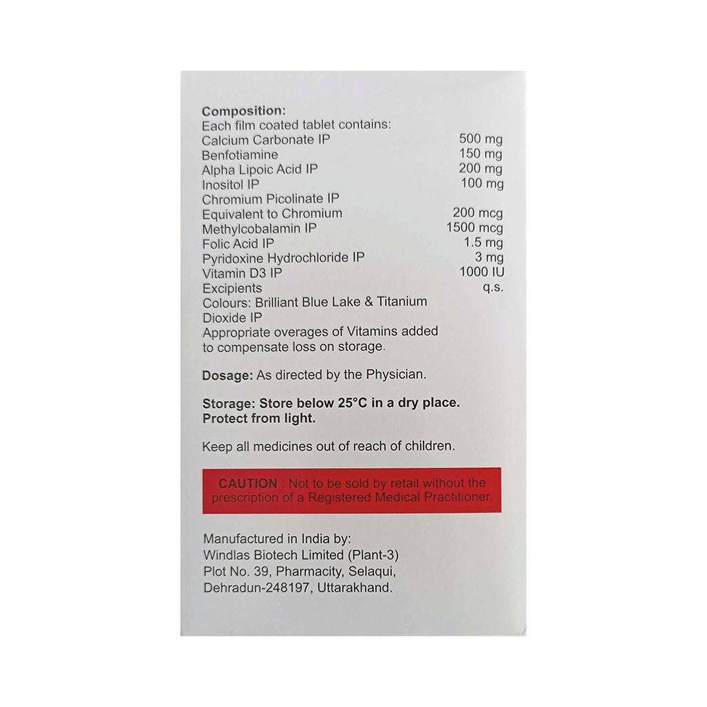 Salt Composition: Calcium Carbonate (500mg) + Benfotiamine (150mg) + Alpha Lipoic Acid (200mg) + Inositol (100mg) + Chromium Picolinate (200mcg) + Methylcobalamin (1500mcg) + Folic Acid (1.5mg) + Pyridoxine Hydrochloride (3mg) + Vitamin D3 (1000IU)