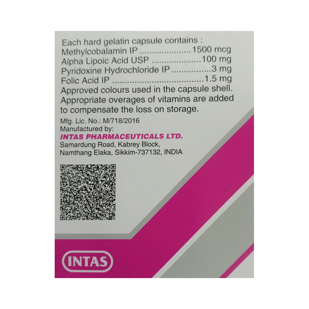 Salt Composition: Methylcobalamin (1500mcg) + Alpha Lipoic Acid (100mg) + Vitamin B6 (Pyridoxine) (3mg) + Folic Acid (1.5mg)