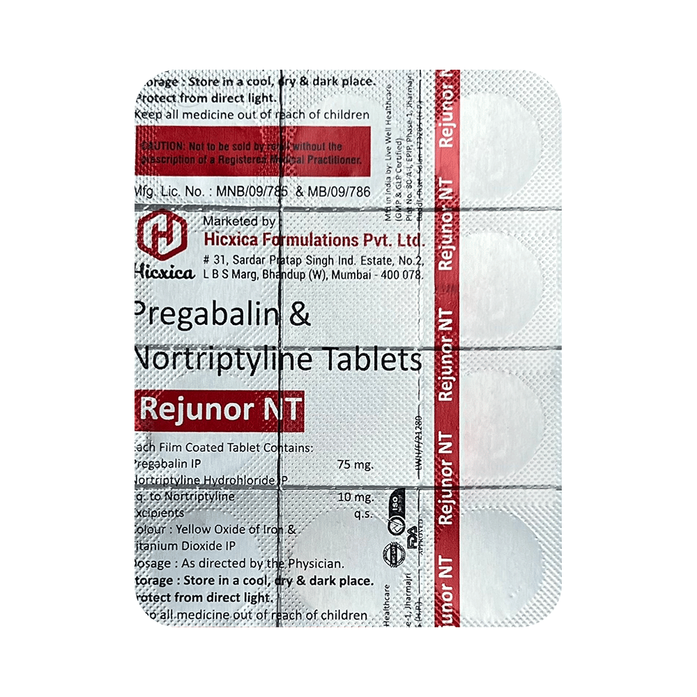 Rejunor NT Tablet is a combination of two medicines: Pregabalin and Nortriptyline. Pregabalin is an alpha-2 delta ligand that decreases pain by modulating the calcium channel activity of the nerve cells. Nortriptyline is a tricyclic antidepressant that increases the levels of chemical messengers (serotonin and noradrenaline) that stop the movement of pain signals in the brain. Together, they relieve neuropathic pain (pain from damaged nerves).