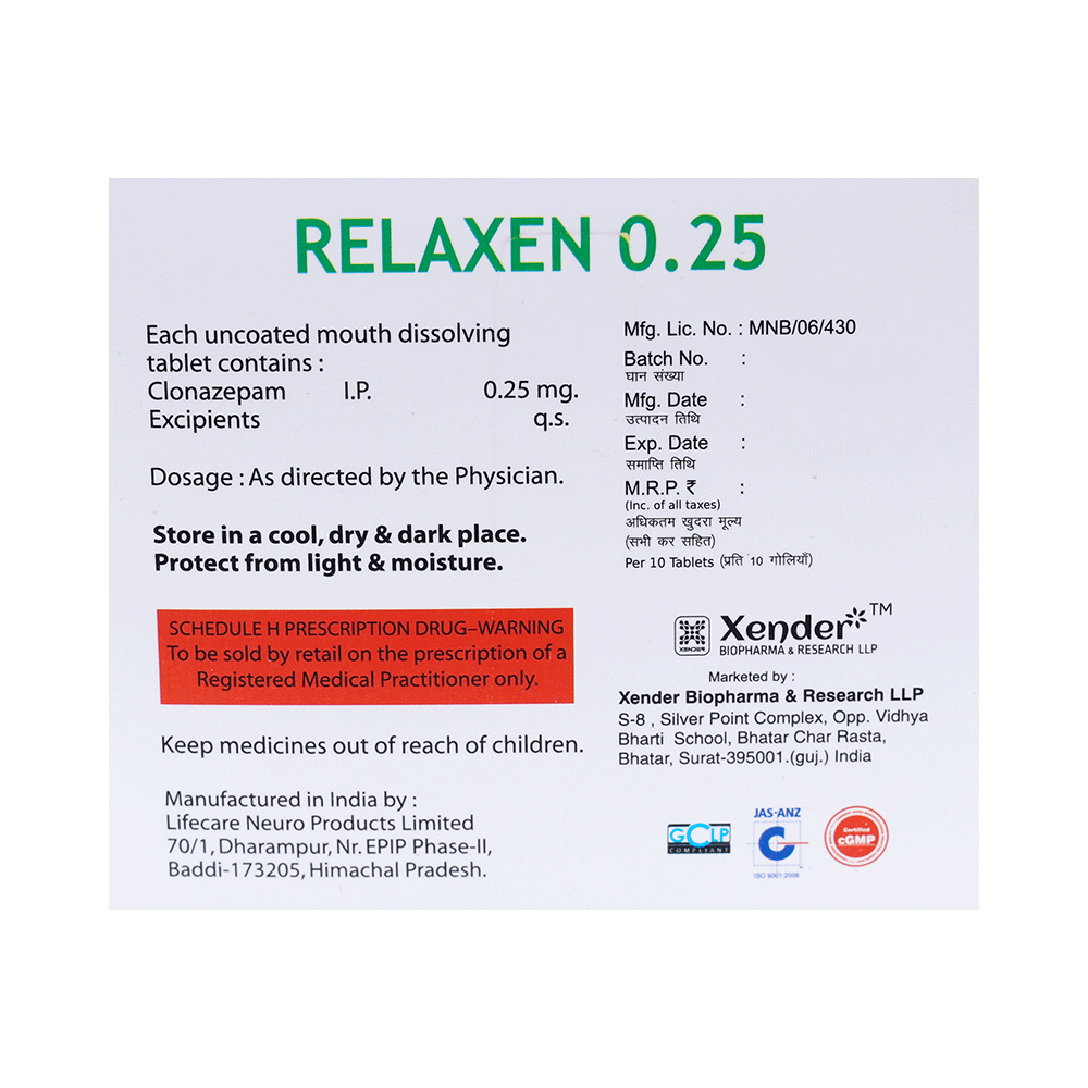In Treatment of Anxiety disorderRelaxen 0.25 Tablet MD stops your brain from releasing the chemicals that make you feel anxious so it can reduce the symptoms of excessive anxiety and worry. It can also reduce feelings of restlessness, tiredness, difficulty concentrating, feeling irritable and sleep problems that often come with Anxiety Disorder. It will therefore help you go about your daily activities more easily and be more productive. Keep taking this medicine even if you feel well. Stopping suddenly can cause serious problems.In Treatment of Epilepsy/SeizuresRelaxen 0.25 Tablet MD slows down electrical signals in the brain which cause seizures (fits). It can also help reduce symptoms such as confusion, uncontrollable jerking movements, loss of awareness, and fear or anxiety. The medicine can allow you to do some activities that you would otherwise be forbidden or scared to do (such as swimming and driving). It can take a few weeks for this medicine to work (because the dose has to be increased slowly) and during this time you may still have seizures. Do not stop using this medicine even if you feel well, until your doctor advises you to. Missing doses may trigger a seizure.show moreshow less