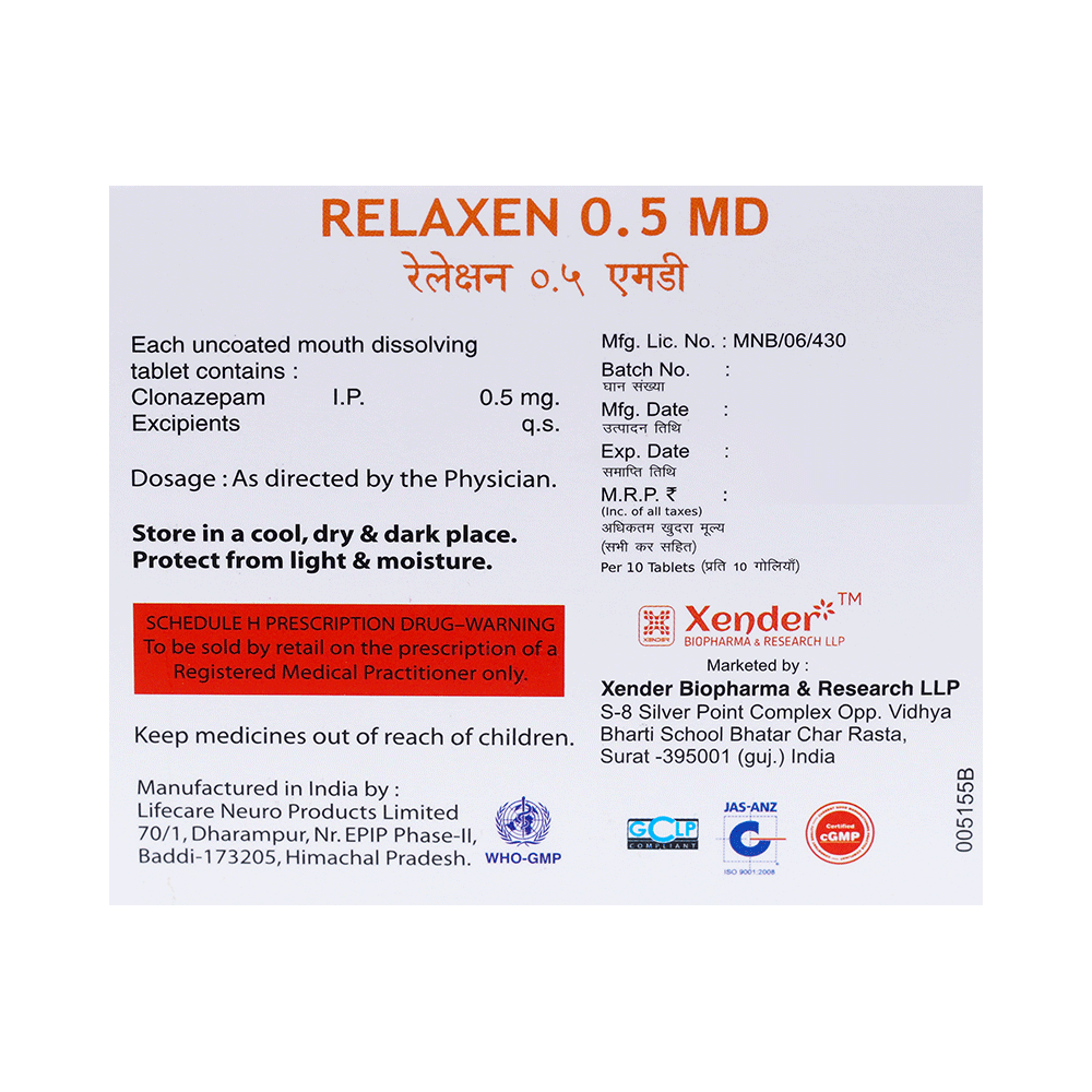 In Treatment of Anxiety disorderRelaxen 0.5 MD Tablet stops your brain from releasing the chemicals that make you feel anxious so it can reduce the symptoms of excessive anxiety and worry. It can also reduce feelings of restlessness, tiredness, difficulty concentrating, feeling irritable and sleep problems that often come with Anxiety Disorder. It will therefore help you go about your daily activities more easily and be more productive. Keep taking this medicine even if you feel well. Stopping suddenly can cause serious problems.In Treatment of Epilepsy/SeizuresRelaxen 0.5 MD Tablet slows down electrical signals in the brain which cause seizures (fits). It can also help reduce symptoms such as confusion, uncontrollable jerking movements, loss of awareness, and fear or anxiety. The medicine can allow you to do some activities that you would otherwise be forbidden or scared to do (such as swimming and driving). It can take a few weeks for this medicine to work (because the dose has to be increased slowly) and during this time you may still have seizures. Do not stop using this medicine even if you feel well, until your doctor advises you to. Missing doses may trigger a seizure.show moreshow less
