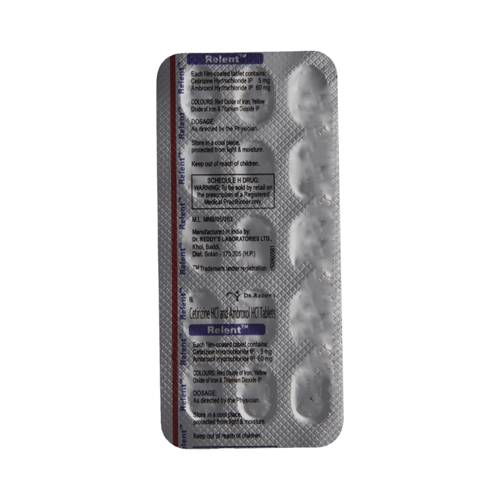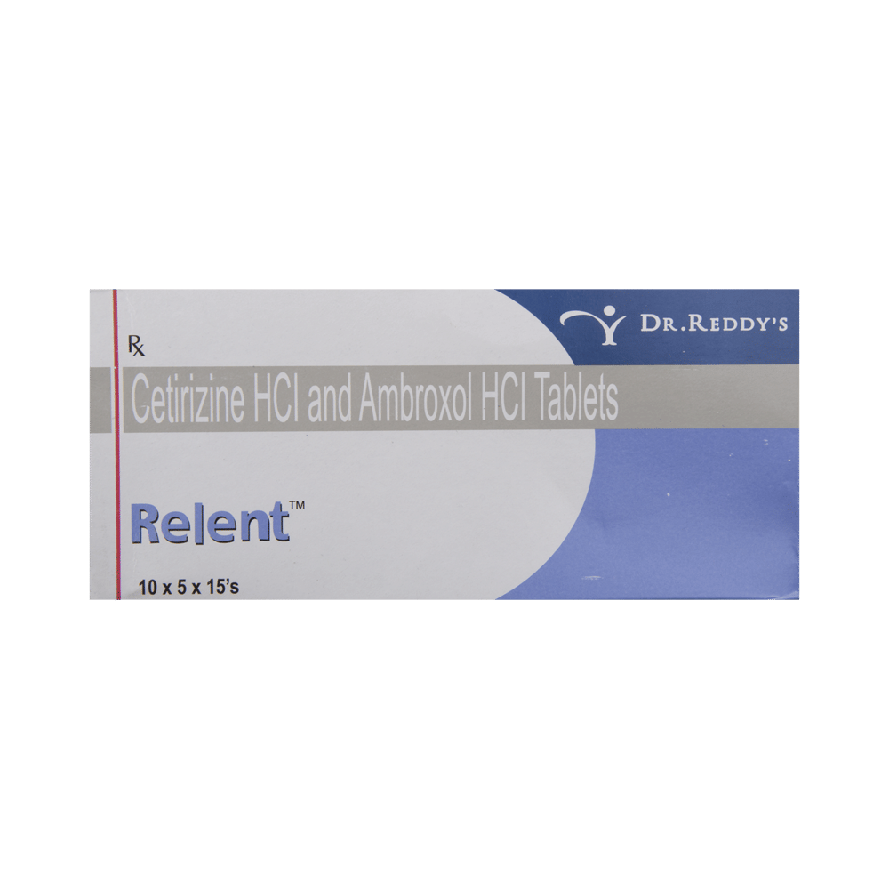 Relent Tablet is a combination medicine used in the treatment of cough. It relieves allergic symptoms such as sneezing, running nose, watery eyes, itching, swelling, and congestion or stiffness. It also thins and loosens mucus, making it easier to cough out. Relent Tablet is taken with or without food in a dose and duration as advised by the doctor. The dose you are given will depend on your condition and how you respond to the medicine. You should keep taking this medicine for as long as your doctor recommends. If you stop treatment too early your symptoms may come back and your condition may worsen. Let your doctor know about all other medications you are taking as some may affect, or be affected by this medicine.The most common side effects are stomach upset, dryness in mouth, fatigue, sedation, and allergic reaction. Most of these are temporary and usually resolve with time. Contact your doctor straight away if you are at all concerned about any of these side effects. This medicine can also cause dizziness and sleepiness, so do not drive or do anything that requires mental focus until you know how this medicine affects you. Avoid drinking alcohol while taking this medicine as it can make dizziness worse.Never support self-medication or recommend your medicine to another person. It is beneficial to have plenty of fluids while taking this medication. Before taking it, you should tell your doctor if you have any kidney and liver diseases. Pregnant or breastfeeding women should also consult their doctor before taking this medicine.