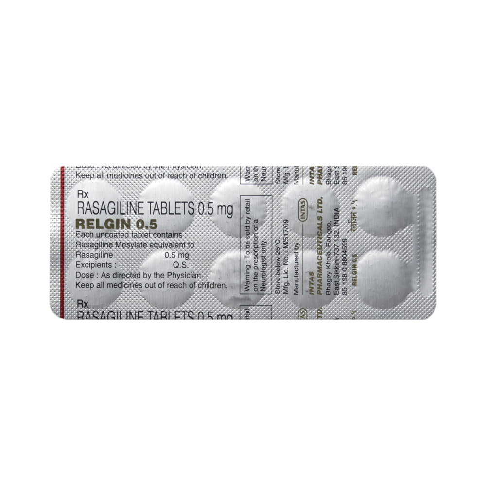 Relgin 0.5 Tablet is a medicine used to treat Parkinson's disease. It helps to provide better control of body movements and prevents excessive shaking and stiffness. Relgin 0.5 Tablet can be taken alone or in combination with other medicines. It may be taken with or without food. However, it is advised to take it at the same time each day as this helps to maintain a consistent level of medicine in the body. Take this medicine in the dose and duration as advised by your doctor.If you have missed a dose, take it as soon as you remember it. You should never skip any doses and try to finish the full course of treatment even if you feel better. This medication mustn't be stopped suddenly without talking to your doctor as it can result in confusion, stiff muscles, and a high fever.Some common side effects of this medicine include joint pain, insomnia (difficulty sleeping), dyspepsia (indigestion), influenza or cold-like symptoms, depression, cough, and peripheral edema (swelling in the extremities, especially lower limbs).It even causes dizziness and sleepiness, so do not drive or do anything that requires mental focus until you know how this medicine affects you. You should undergo periodic examinations to detect skin cancer while taking this medicine as it increases the risk of developing cancer. Inform your doctor if you develop any unusual changes in mood, hallucinations, an abnormally high sex drive, an urge to gamble, or uncontrolled spending as these may prove very harmful.