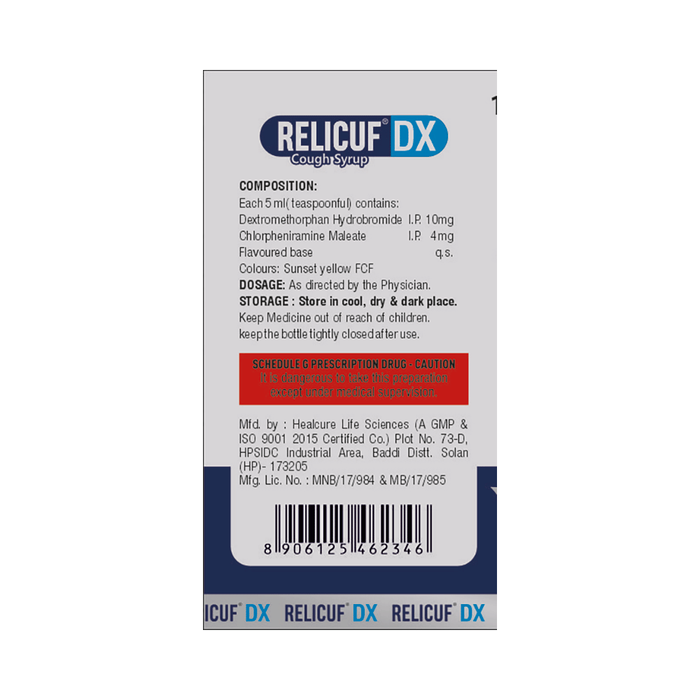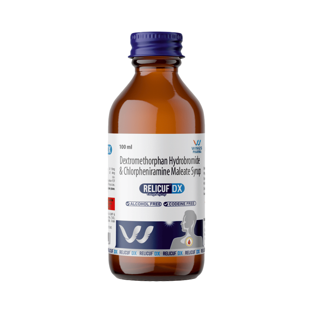 Relicuf DX Syrup is a combination of two medicines: Chlorpheniramine Maleate and Dextromethorphan Hydrobromide, which relieves dry cough. Chlorpheniramine Maleate is an antiallergic which helps reduce cough associated with allergies by blocking the effects of a chemical messenger, histamine. Dextromethorphan Hydrobromide is a cough suppressant which relieves cough by reducing the activity of cough center in the brain.