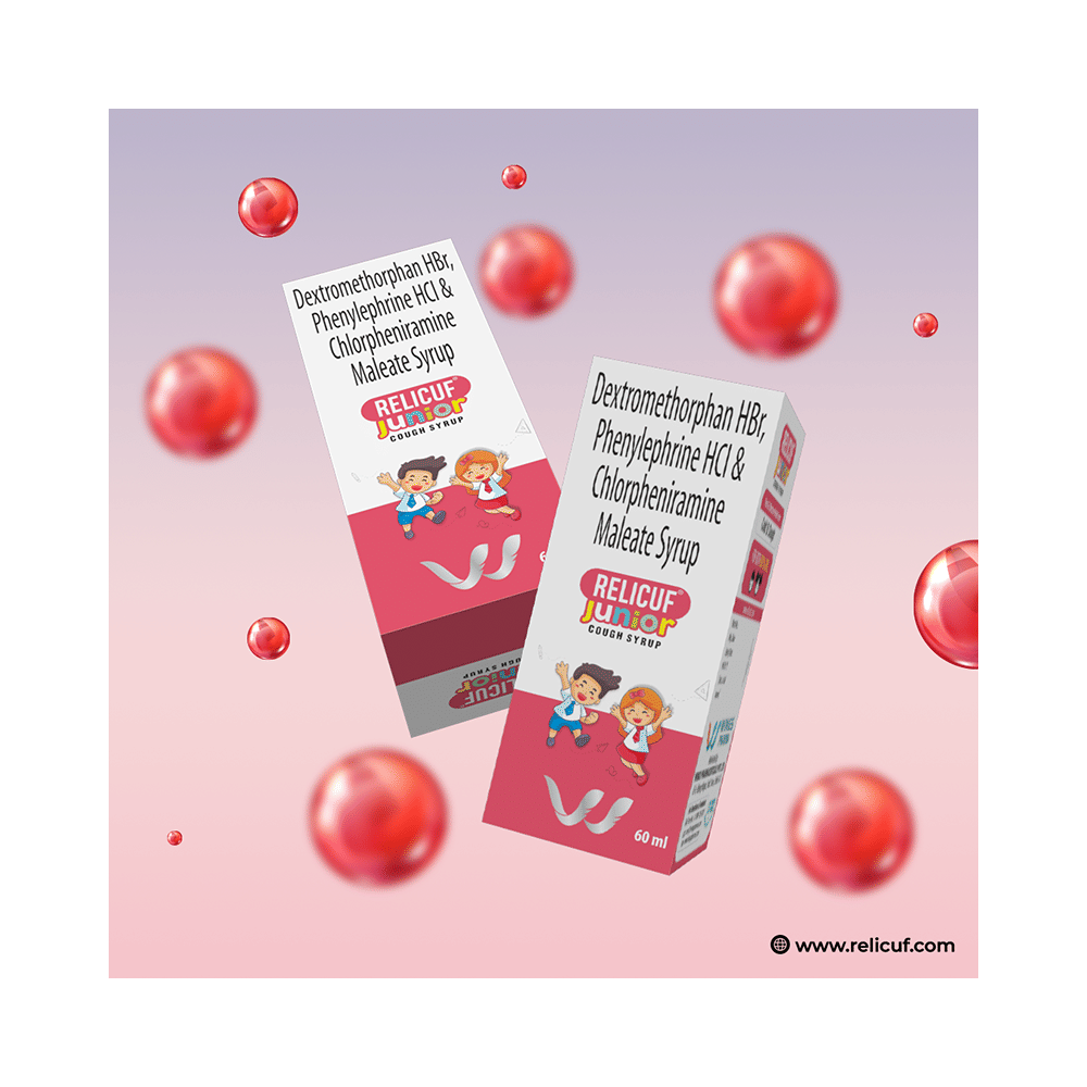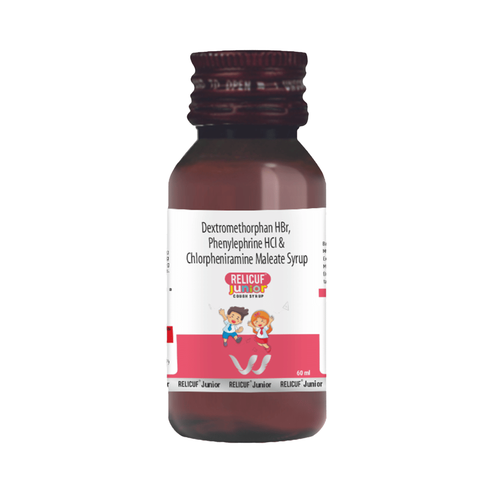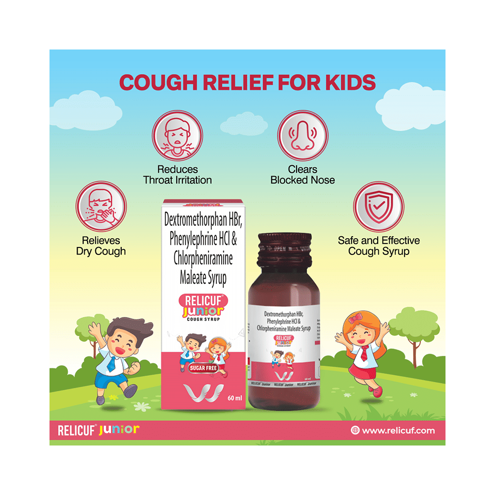 Relicuf Junior Syrup Sugar Free is a medicine used in the treatment of common cold and cough. It can provide quick relief from cough and common cold symptoms like runny nose, stuffy nose, sneezing, watery eyes, and congestion or stuffiness. Relicuf Junior Syrup Sugar Free is taken with or without food in a dose and duration as advised by the doctor. The dose you are given will depend on your condition and how you respond to the medicine. You should keep taking this medicine for as long as your doctor recommends. If you stop treatment too early your symptoms may come back and your condition may worsen. Let your healthcare team know about all other medications you are taking as some may affect, or be affected by this medicine.Common side effects of this medicine include headache, sedation, double vision, vomiting, diarrhea, dry mouth, and nausea. Most of these are temporary and usually resolve with time. Contact your doctor straight away if you are at all concerned about any of these side effects. This medicine can also cause sleepiness, so do not drive or do anything that requires mental focus until you know how this medicine affects you. Avoid drinking alcohol while taking this medicine as it can worsen your sleepiness.Never support self-medication or recommend your medicine to another person. It is beneficial to have plenty of fluids while taking this medication. Before taking this medicine, you should tell your doctor if you are pregnant, planning pregnancy or breastfeeding. You should also tell your doctor if you have any kidney or liver diseases so that your doctor can prescribe a suitable dose for you.