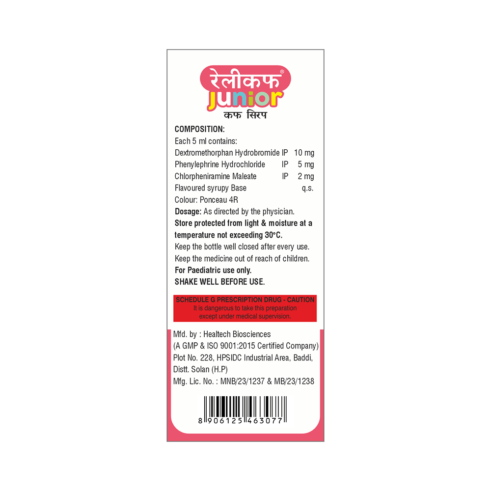 Relicuf Junior Syrup Sugar Free is a combination of three medicines: Phenylephrine, Chlorpheniramine Maleate, and Dextromethorphan Hydrobromide. Phenylephrine is a decongestant which narrows the small blood vessels providing relief from congestion or stuffiness in the nose. Chlorpheniramine Maleate is an antiallergic which relieves allergy symptoms like runny nose, watery eyes and sneezing. Dextromethorphan Hydrobromide is a cough suppressant which relieves cough by reducing the activity of cough center in the brain.