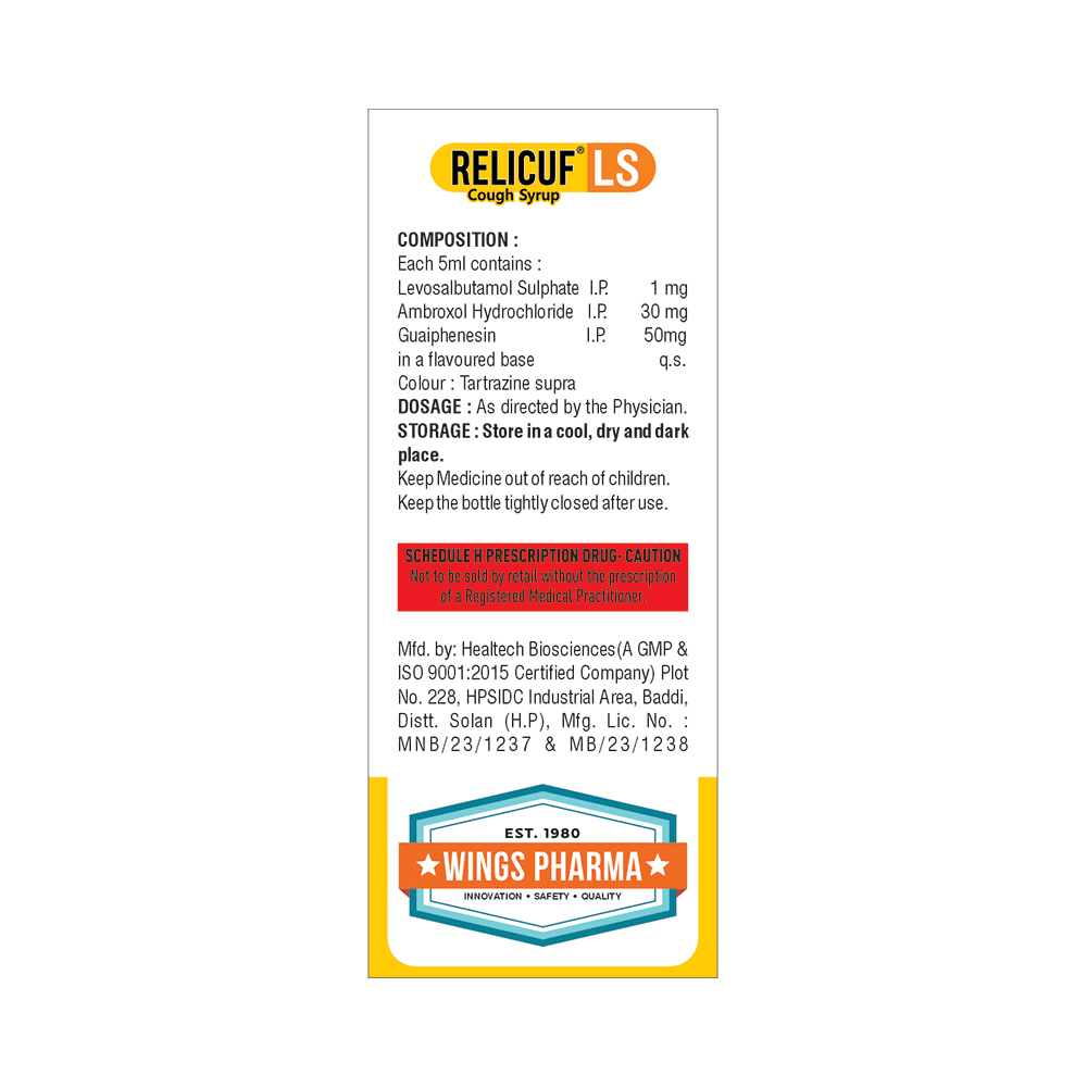 Relicuf LS Syrup relieves cough accompanied with mucus that is associated with broncho-pulmonary disorders such as bronchitis, bronchial asthma and emphysema.