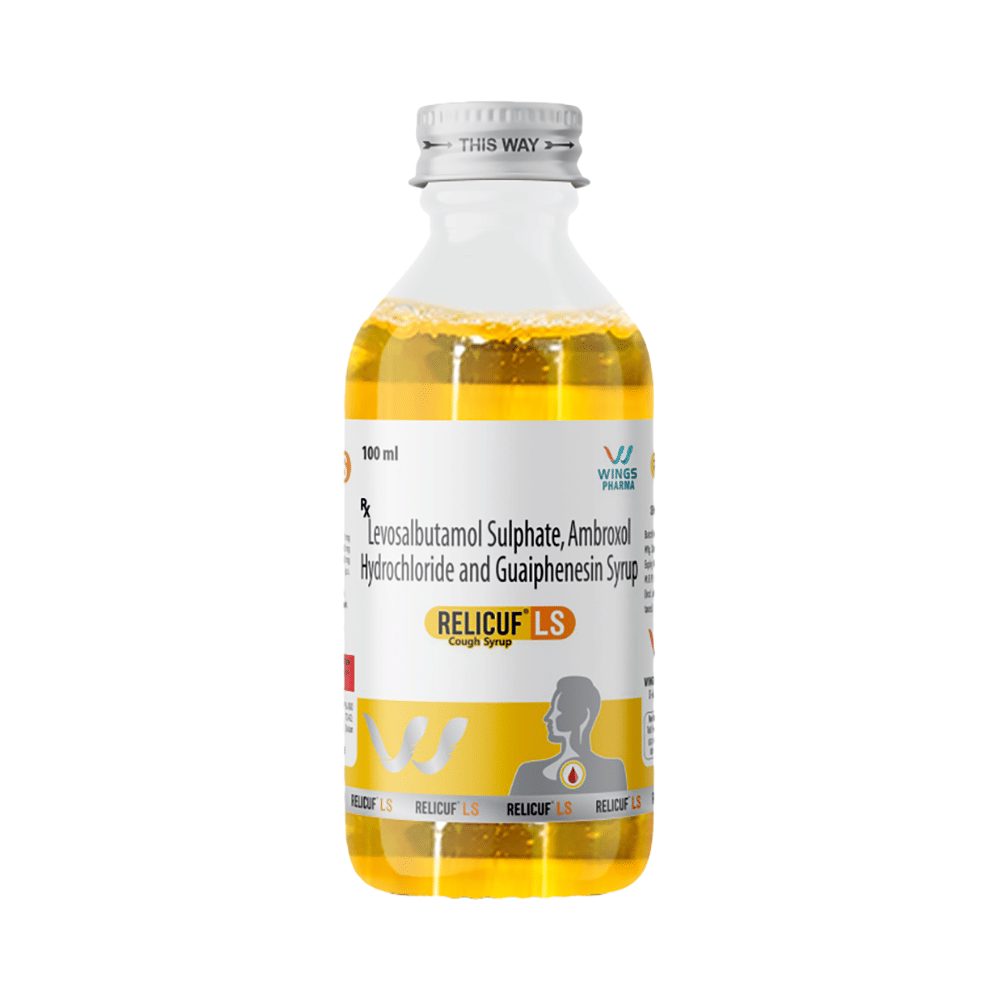 Relicuf LS Syrup is a combination of three medicines: Levosalbutamol, Ambroxol and Guaifenesin which relieve cough with mucus. Levosalbutamol is a bronchodilator. It works by relaxing the muscles in the airways and widens airways. Ambroxol is a mucolytic which thins and loosens mucus (phlegm), making it easier to cough out. Guaifenesin is an expectorant which decreases the stickiness of mucus (phlegm) and helps in its removal from the airways.