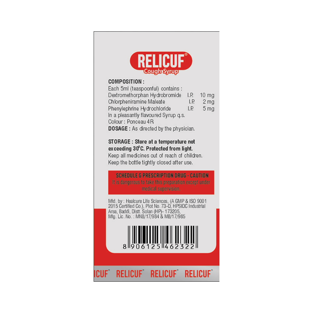 Relicuf Syrup is a combination of three medicines: Phenylephrine, Chlorpheniramine Maleate, and Dextromethorphan Hydrobromide. Phenylephrine is a decongestant which narrows the small blood vessels providing relief from congestion or stuffiness in the nose. Chlorpheniramine Maleate is an antiallergic which relieves allergy symptoms like runny nose, watery eyes and sneezing. Dextromethorphan Hydrobromide is a cough suppressant which relieves cough by reducing the activity of cough center in the brain.