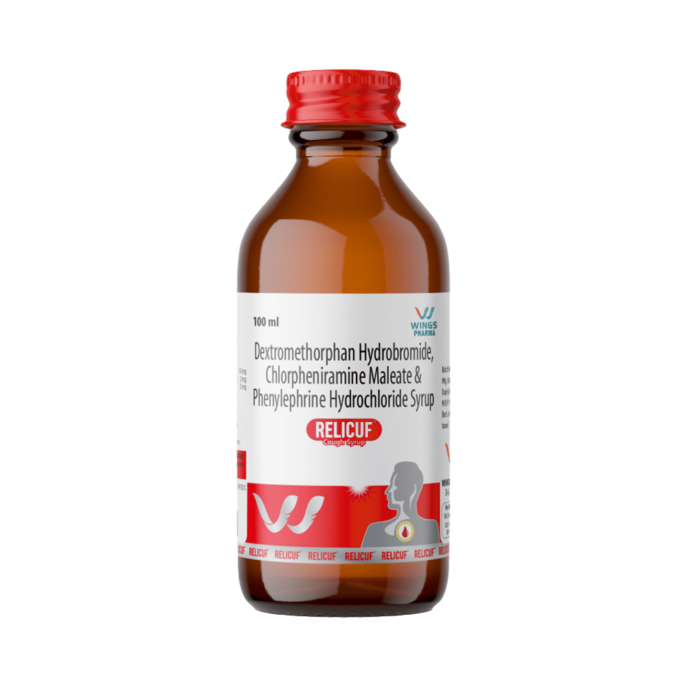 Relicuf Syrup is a medicine used in the treatment of common cold and cough. It can provide quick relief from cough and common cold symptoms like runny nose, stuffy nose, sneezing, watery eyes, and congestion or stuffiness. Relicuf Syrup is taken with or without food in a dose and duration as advised by the doctor. The dose you are given will depend on your condition and how you respond to the medicine. You should keep taking this medicine for as long as your doctor recommends. If you stop treatment too early your symptoms may come back and your condition may worsen. Let your healthcare team know about all other medications you are taking as some may affect, or be affected by this medicine.Common side effects of this medicine include headache, sedation, double vision, vomiting, diarrhea, dry mouth, and nausea. Most of these are temporary and usually resolve with time. Contact your doctor straight away if you are at all concerned about any of these side effects. This medicine can also cause sleepiness, so do not drive or do anything that requires mental focus until you know how this medicine affects you. Avoid drinking alcohol while taking this medicine as it can worsen your sleepiness.Never support self-medication or recommend your medicine to another person. It is beneficial to have plenty of fluids while taking this medication. Before taking this medicine, you should tell your doctor if you are pregnant, planning pregnancy or breastfeeding. You should also tell your doctor if you have any kidney or liver diseases so that your doctor can prescribe a suitable dose for you.