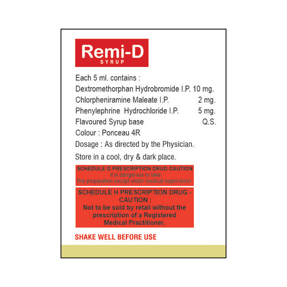 Remi-D Syrup is a medicine used in the treatment of common cold and cough. It can provide quick relief from cough and common cold symptoms like runny nose, stuffy nose, sneezing, watery eyes, and congestion or stuffiness. Remi-D Syrup is taken with or without food in a dose and duration as advised by the doctor. The dose you are given will depend on your condition and how you respond to the medicine. You should keep taking this medicine for as long as your doctor recommends. If you stop treatment too early your symptoms may come back and your condition may worsen. Let your healthcare team know about all other medications you are taking as some may affect, or be affected by this medicine.Common side effects of this medicine include headache, sedation, double vision, vomiting, diarrhea, dry mouth, and nausea. Most of these are temporary and usually resolve with time. Contact your doctor straight away if you are at all concerned about any of these side effects. This medicine can also cause sleepiness, so do not drive or do anything that requires mental focus until you know how this medicine affects you. Avoid drinking alcohol while taking this medicine as it can worsen your sleepiness.Never support self-medication or recommend your medicine to another person. It is beneficial to have plenty of fluids while taking this medication. Before taking this medicine, you should tell your doctor if you are pregnant, planning pregnancy or breastfeeding. You should also tell your doctor if you have any kidney or liver diseases so that your doctor can prescribe a suitable dose for you.