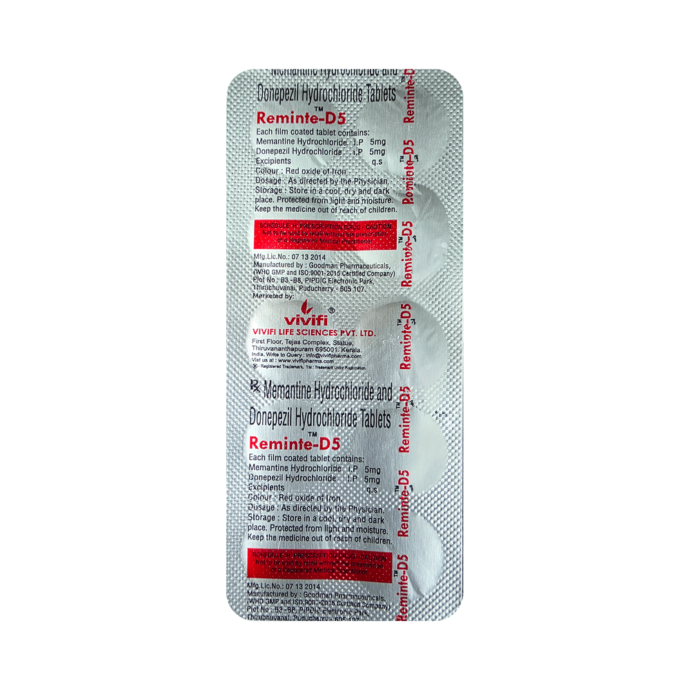 Reminte-D5 Tablet is a prescription medicine used to treat Alzheimer's disease. It helps to slow down the progression of moderate to severe Alzheimer's by improving memory and thinking. It also increases the levels of a chemical messenger involved in the transmission of nerve signals. Reminte-D5 Tablet can be taken with or without food, but you may take it with food to avoid a stomach upset. However, it is advised to take it at the same time each day to maintain a consistent level of medicine in the blood. Do not skip any doses, but if you miss a dose of this medicine, take it as soon as you remember. Finish the full course of treatment even if you feel better and do not stop taking it suddenly.Some common side effects of this medicine include nausea, vomiting, loss of appetite, fatigue, and headache. It may also cause dizziness and sleepiness. So, do not drive or do anything that requires mental focus until you know how this medicine affects you. Drink plenty of fluids to keep yourself hydrated while taking this medicine as this medicine may cause diarrhea.Before using this medicine, you should tell your doctor if you have ever had heart problems, stomach ulcers, epilepsy or asthma. It may also affect, or be affected by, some other drugs you are using so let your doctor know what these are to be safe. Inform your doctor if you are pregnant, planning pregnancy or breastfeeding.