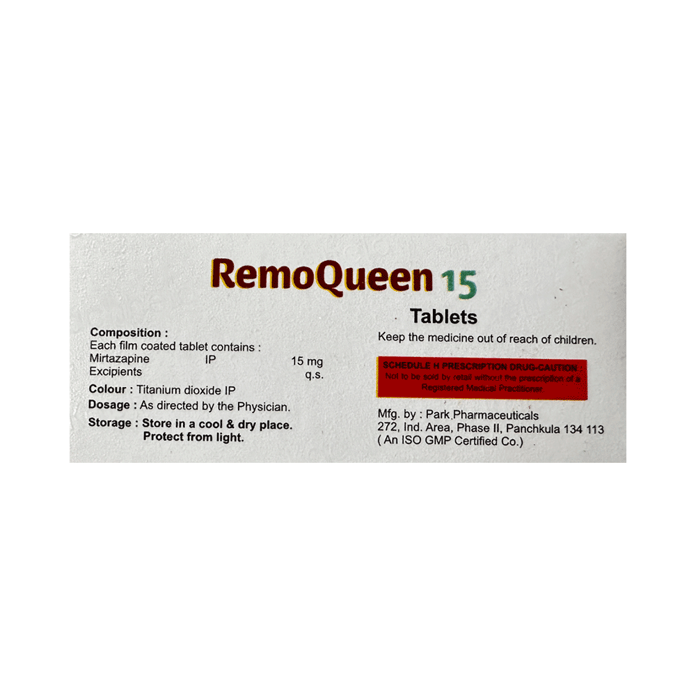 Remoqueen 15 Tablet is used in the treatment of depression. This medicine works by increasing the level of chemical messengers (serotonin and noradrenaline) in the brain that help calm the brain and relax the nerves, thus treating your depression. Remoqueen 15 Tablet may be taken with or without food. It is advised to take this medicine at a fixed time each day to maintain a consistent level in the blood. If you miss any doses, take it as soon as you remember. Do not skip any doses and finish the full course of treatment even if you feel better. It is important that this medication is not stopped suddenly as it may worsen your symptoms.Some common side effects of this medicine include dryness in the mouth, increased appetite, and headaches. It even causes dizziness and sleepiness, so do not drive or do anything that requires mental focus until you know how this medicine affects you. This medicine may cause weight gain; therefore, you should have a balanced diet and exercise regularly. Moreover, it is important to inform your doctor if you develop a sore throat or fever after taking this medicine.