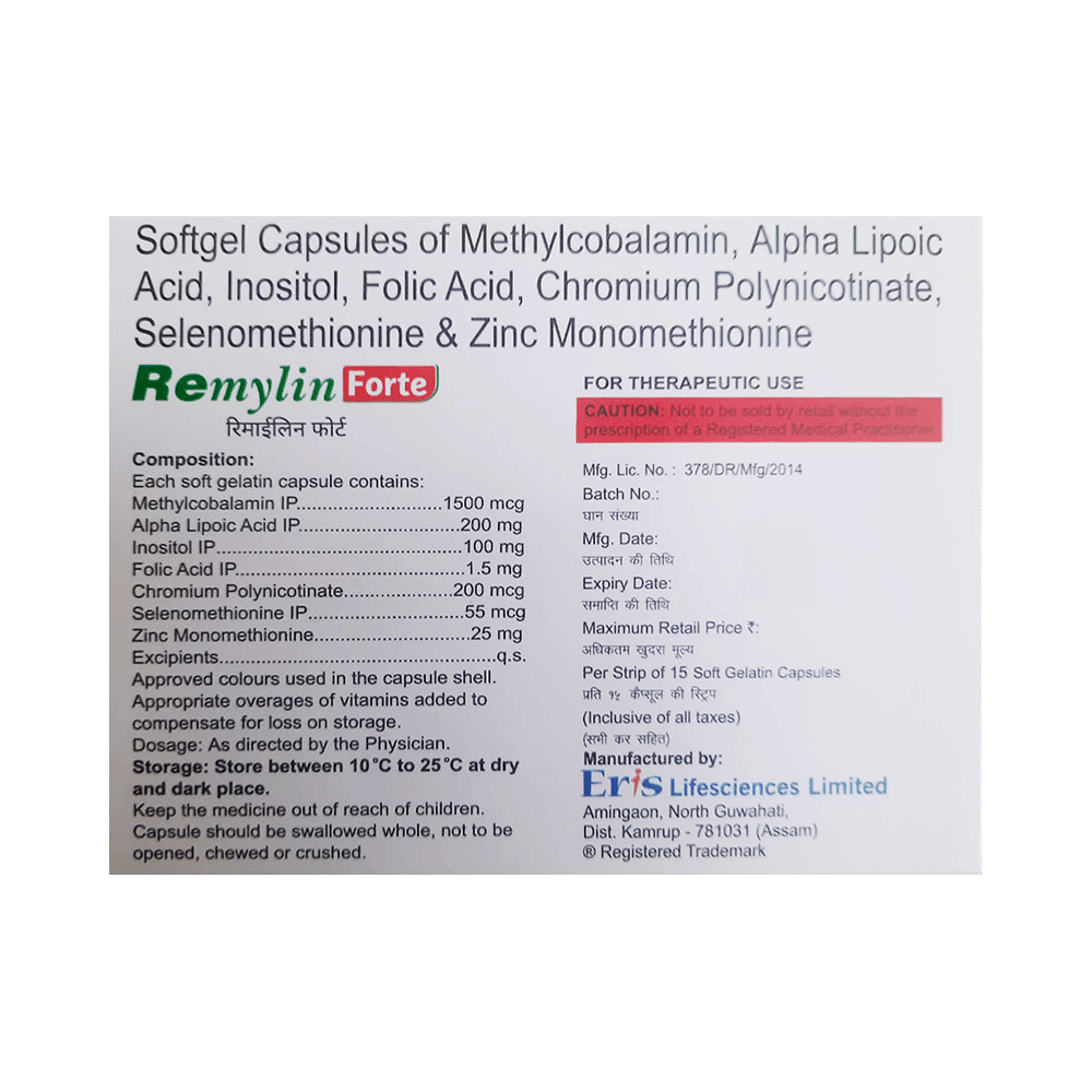 Remylin Forte Softgel Capsule is a combination of seven medicines: methylcobalamin, alpha lipoic acid, folic acid, inositol, chromium polynicotinate, selenomethionine, and zinc monomethionine. Methylcobalamin is a form of vitamin B12 that restores its level in the body, thereby helping in treating certain anemias and nerve problems. Alpha lipoic acid acts as a potent antioxidant (a substance that protects against cell damage) by neutralizing the free radicals (waste products formed in the body during energy production) such as reactive oxygen and nitrogen species. Further, it initiates natural antioxidant processes in the body. It also maintains the levels of vitamin E and vitamin C in the body. Folic acid is a form of vitamin B. It plays a vital role in the formation of red blood cells, which carry oxygen throughout the body. Inositol works by relaxing the blood vessels and improving blood flow to the legs, toes, and fingers, thereby relieving pain. Chromium polynicotinate, selenomethionine, and zinc monomethionine are nutritional supplements that provide essential nutrients to our body and improve overall health.