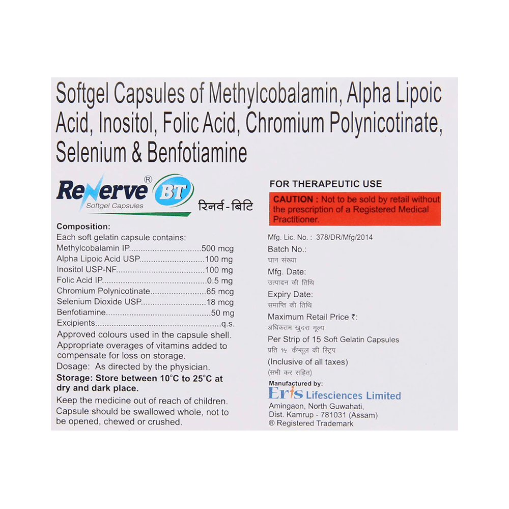 Renerve B T Capsule is a combination of Methylcobalamin, Alpha Lipoic Acid, Myo-Inositol, Folic Acid, Chromium Picolinate, Selenium, and Benfotiamine. Methylcobalamin is a form of vitamin B12 that restores its level in the body thereby helping in treating certain anemias and nerve problems. Alpha lipoic acid acts as a potent antioxidant (substance that protects against cell damage) by neutralizing the free radicals (waste products formed in the body during energy production) such as reactive oxygen and nitrogen species. Further, it initiates natural antioxidant processes in the body. It also maintains the levels of Vitamin E and Vitamin C in the body. Myo-inositol works by relaxing the blood vessels and improving blood flow to the legs, toes and fingers, thereby relieving pain. Folic Acid is a form of vitamin B. It plays a vital role in the formation of red blood cells, which carry oxygen throughout the body. It is also essential in pregnancy due to its role in the development of the unborn baby's brain and spinal cord. Chromium Picolinate, Selenium, and Benfotiamine are nutritional supplements that provide essential nutrients to our body and improve overall health.