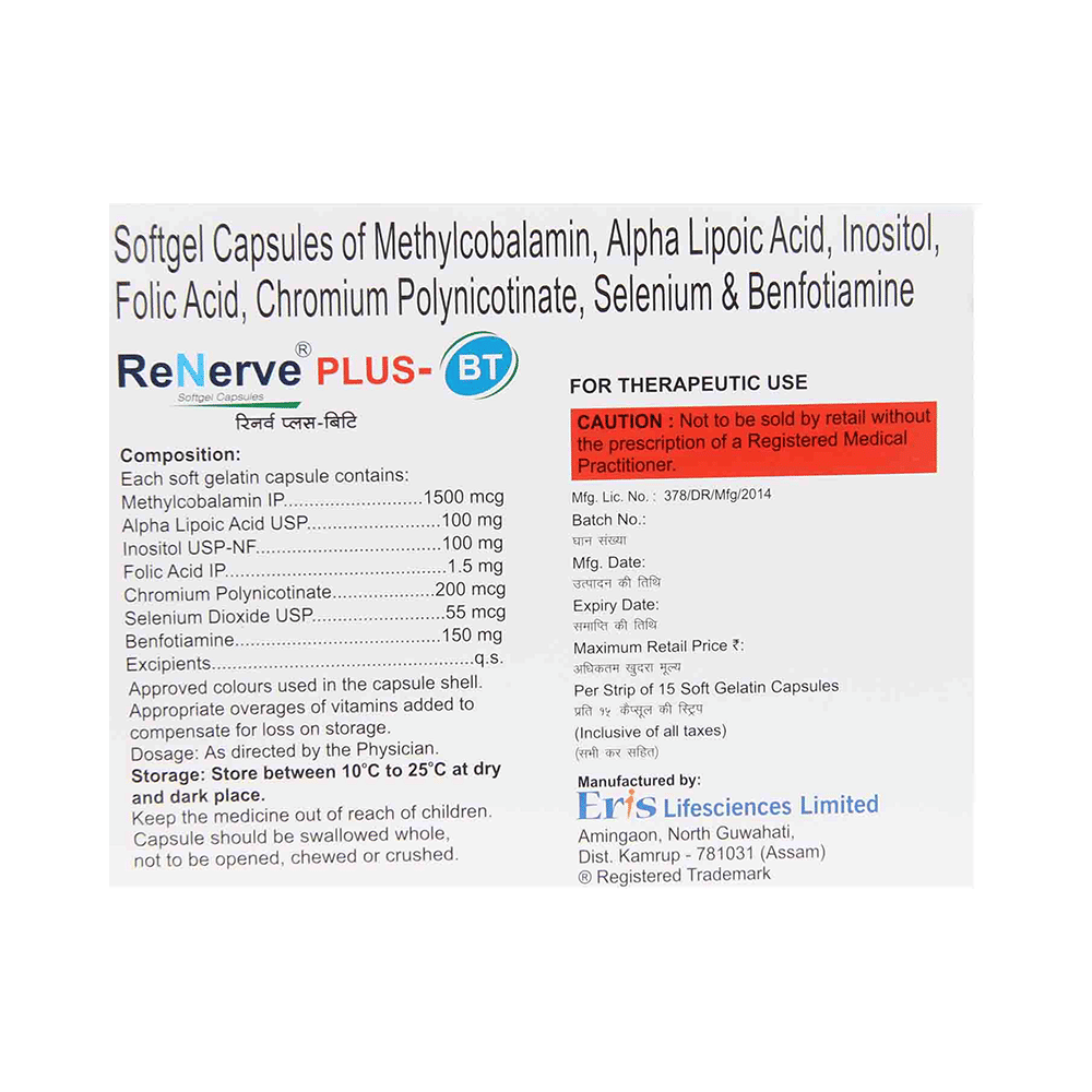 Renerve Plus BT Capsule is a combination of Methylcobalamin, Alpha Lipoic Acid, Myo-Inositol, Folic Acid, Chromium Picolinate, Selenium, and Benfotiamine. Methylcobalamin is a form of vitamin B12 that restores its level in the body thereby helping in treating certain anemias and nerve problems. Alpha lipoic acid acts as a potent antioxidant (substance that protects against cell damage) by neutralizing the free radicals (waste products formed in the body during energy production) such as reactive oxygen and nitrogen species. Further, it initiates natural antioxidant processes in the body. It also maintains the levels of Vitamin E and Vitamin C in the body. Myo-inositol works by relaxing the blood vessels and improving blood flow to the legs, toes and fingers, thereby relieving pain. Folic Acid is a form of vitamin B. It plays a vital role in the formation of red blood cells, which carry oxygen throughout the body. It is also essential in pregnancy due to its role in the development of the unborn baby's brain and spinal cord. Chromium Picolinate, Selenium, and Benfotiamine are nutritional supplements that provide essential nutrients to our body and improve overall health.