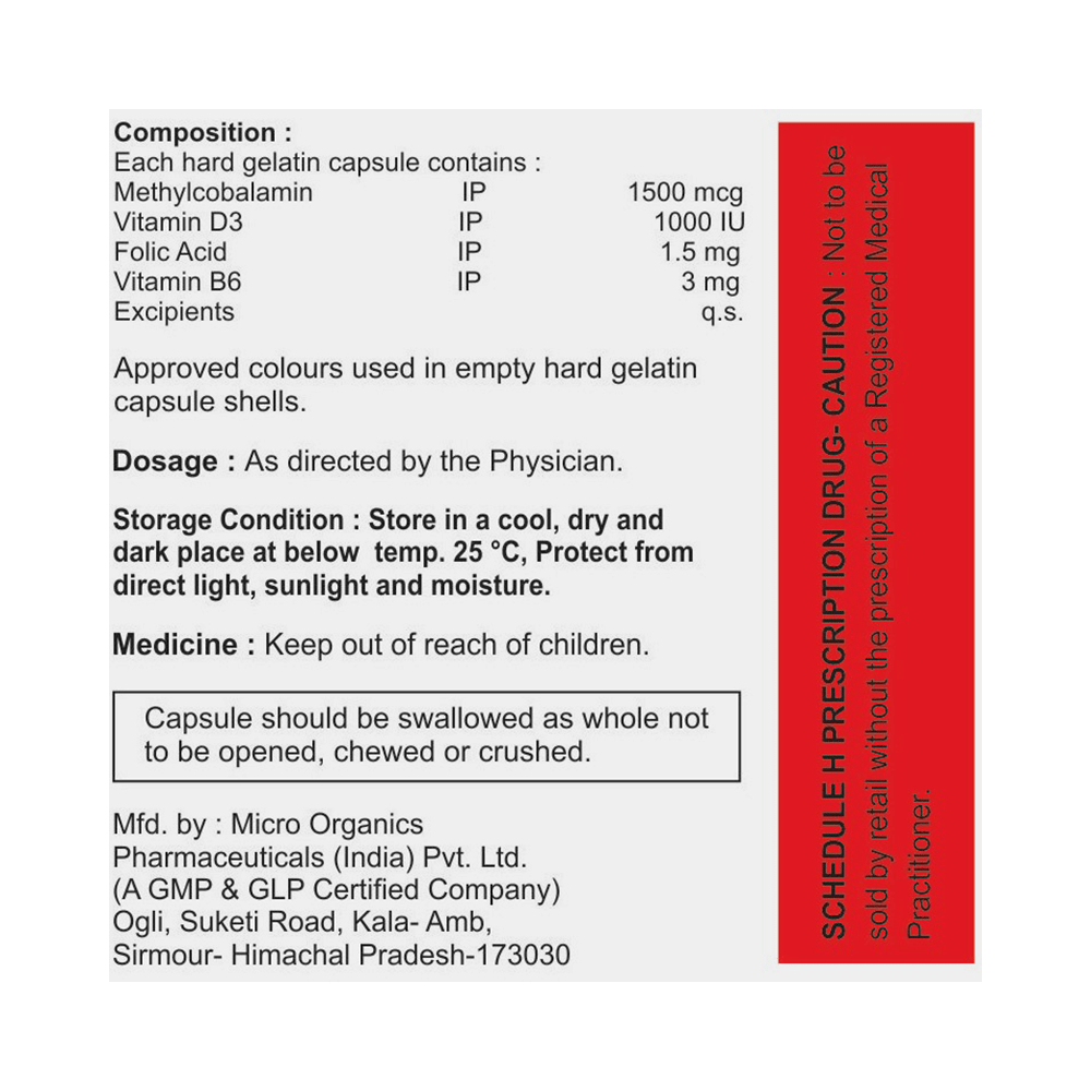 Salt Composition: Methylcobalamin (1500mcg) + Vitamin B6 (Pyridoxine) (3mg) + Folic Acid (1.5mg) + Vitamin D3 (1000IU)