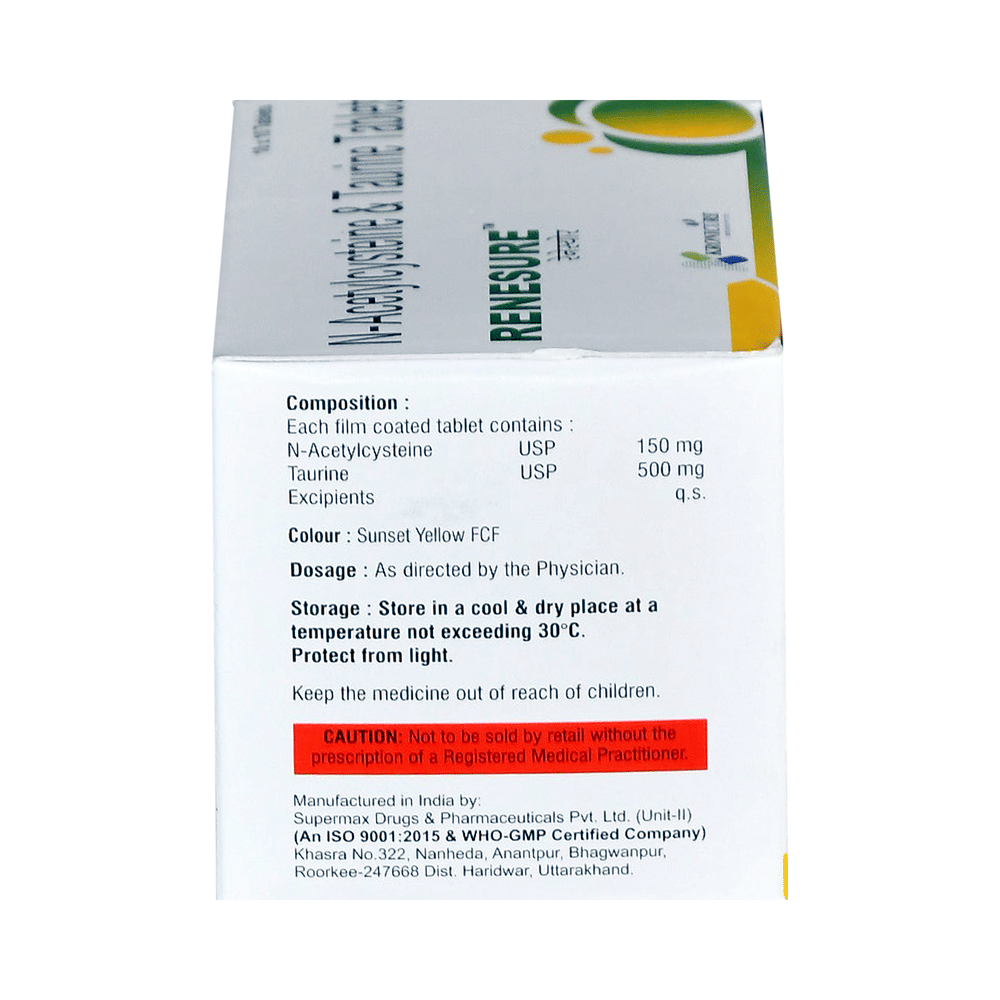Renesure Tablet is a combination of two antioxidants: Taurine and Acetylcysteine. These antioxidants work by protecting the kidneys from damage by harmful chemical (free radicals).