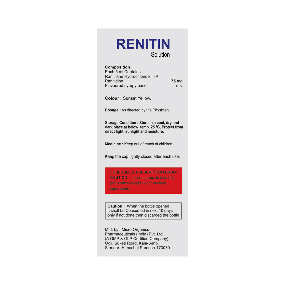 Renitin Oral Solution Mint is a medicine that reduces the amount of acid your stomach makes. It is used to treat and prevent heartburn, indigestion, and other symptoms caused by too much acid in the stomach. It is also used to treat and prevent stomach ulcers, reflux disease, and some rarer conditions. Renitin Oral Solution Mint is also commonly prescribed to prevent stomach ulcers and heartburn seen with the use of painkillers. The medicine must be taken in dose and duration as prescribed by the doctor. How much you need, and how often you take it, will depend on what you are being treated for. Follow the advice of your doctor. This medicine should relieve indigestion and heartburn within a few hours and you may only need to take it for a short time when you have symptoms. If you are taking it to prevent ulcers and other conditions you may need to take it for longer. You should keep taking it regularly to prevent problems from happening in the future. You may be able to help improve your symptoms by eating smaller meals more often and avoiding spicy or fatty foods.Most people who take it do not have any side effects but the most common include headache, constipation, feeling drowsy or tired, and diarrhea. If you do get a side effect, it is usually mild and will go away when you stop taking this medicine or as you adjust to it. Consult your doctor if any of these side effects bother you or do not go away.Before taking it, you should tell your doctor if you have any kidney or liver problems. This may affect the dose or suitability of this medicine. Also tell your doctor what other medicines you are taking as some may affect, or be affected by, this medicine. This medicine is usually considered safe to take during pregnancy and breastfeeding if it has been prescribed by a doctor. Avoid drinking alcohol as this can increase the amount of acid in your stomach and make your symptoms worse.