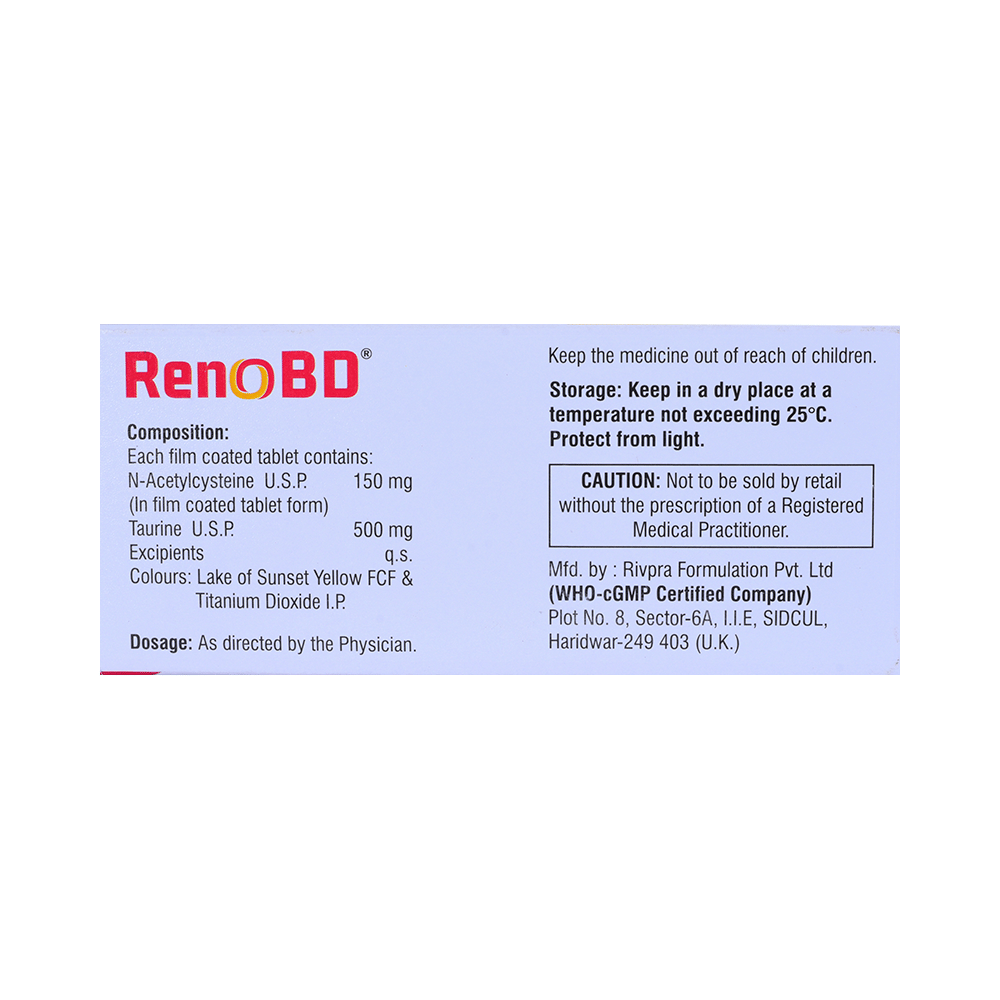 Renobd-Forte Tablet is a combination of two antioxidants: Taurine and Acetylcysteine. These antioxidants work by protecting the kidneys from damage by harmful chemical (free radicals).