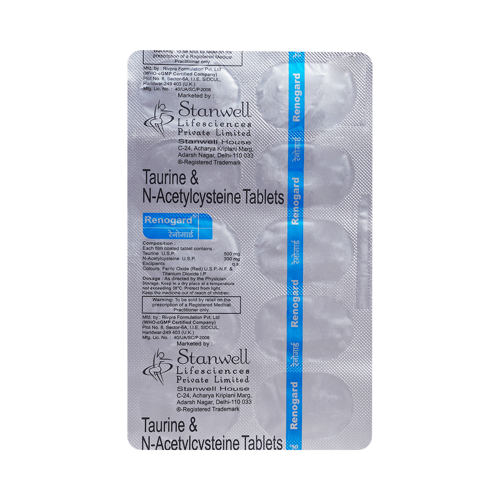 Renogard Tablet is a combination of two antioxidants: Taurine and Acetylcysteine. These antioxidants work by protecting the kidneys from damage by harmful chemical (free radicals).