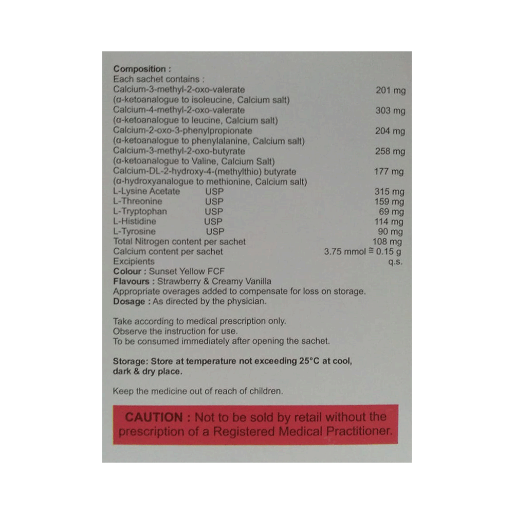 Renotreat Sachet is a nutritional supplement used in the treatment of chronic kidney disease. It reduces urea levels in the blood and helps prevent the progression of kidney disease. This way it delays the risk of undergoing long-term dialysis. Renotreat Sachet is to be taken by mouth with or without food. Take it in the exact dose and duration as advised by the doctor. Taking it along with a low-protein diet may help get the best of the medicine. Ensure that you maintain adequate calorie intake during treatment. While you are taking this medicine, your doctor may advise regular monitoring of serum calcium levels.There is limited data on the side effects of Renotreat Sachet. Let your doctor know if you experience any symptoms while taking Renotreat Sachet. They may be able to suggest ways to treat or manage the side effects.Before taking Renotreat Sachet, it is important to tell your doctor if you are taking any other medicines for other health conditions. Avoid taking Renotreat Sachet if you are allergic to its ingredients, or have high calcium levels (hypercalcemia). Regular monitoring of calcium levels is recommended during use.Avoid combining Renotreat Sachet with calcium-containing supplements or certain antibiotics (e.g., tetracyclines, quinolones) without consulting a doctor, as they may interfere with absorption. Pregnant, breastfeeding women, and individuals with liver disease should seek a doctor’s advice before use. Avoid activities requiring full mental alertness, such as driving, until you know how the medication affects you.