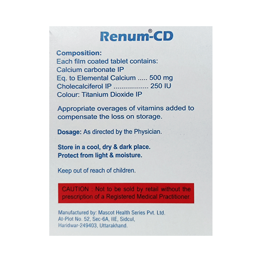 Renum-CD Tablet is a nutritional supplement used in the treatment of calcium deficiency. It is prescribed when your diet alone cannot provide the necessary calcium your body needs. It increases the absorption of calcium and helps prevent or treat low blood calcium levels. Renum-CD Tablet may be taken with or without food. Take it in the dose and duration advised by the doctor. Take it regularly at the same time each day to get maximum benefits from it. Do not take it more than or for longer than prescribed by the doctor, as that may cause harmful effects.There is limited data on the side effects of Renum-CD Tablet. Let your doctor know if you experience any symptoms while taking Renum-CD Tablet. They may be able to suggest ways to treat or manage the side effects.Before you start Renum-CD Tablet, let your doctor know if you have any medical conditions. Let your doctor also know about all the medications you are taking, as some medicines may interact with Renum-CD Tablet. Pregnant or breastfeeding women should consult their doctor before taking Renum-CD Tablet to ensure safety.