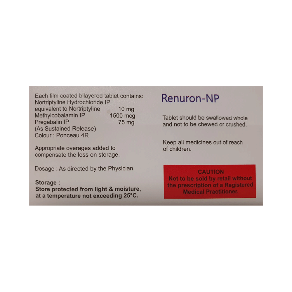 Renuron-NP Tablet SR is a combination of three medicines: Pregabalin, Nortriptyline and Methylcobalamin. Pregabalin is an alpha 2 delta ligand which decreases pain by modulating calcium channel activity of the nerve cells. Nortriptyline is a tricyclic antidepressant which increases the levels of chemical messengers (serotonin and noradrenaline) that stop the movement of pain signals in the brain. Methylcobalamin is a form of vitamin B which helps in the production of myelin, a substance that protects nerve fibers and rejuvenates damaged nerve cells. Together, they relieve neuropathic pain (pain from damaged nerves).