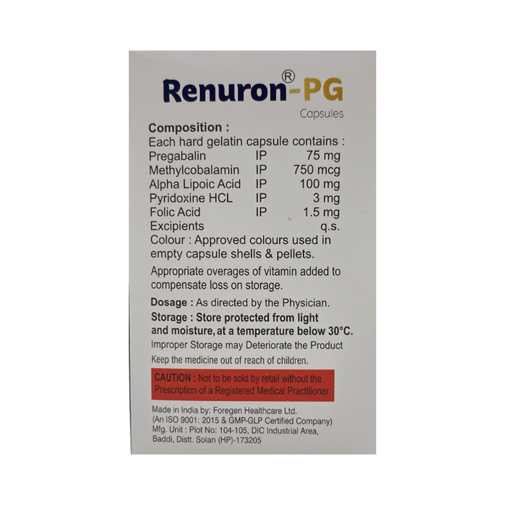 Renuron-PG Capsule is a combination of five medicines: Pregabalin, Methylcobalamin, Folic Acid, Vitamin B6 (Pyridoxine) and Alpha Lipoic Acid. Pregabalin is an alpha 2 delta ligand which decreases pain by modulating calcium channel activity of the nerve cells. Methylcobalamin, Folic Acid and Vitamin B6 (Pyridoxine) are forms of vitamin B which help in the production of myelin, a substance that protects nerve fibers and rejuvenates damaged nerve cells. Alpha Lipoic Acid provides essential nutrients. Together, they relieve neuropathic pain (pain from damaged nerves).