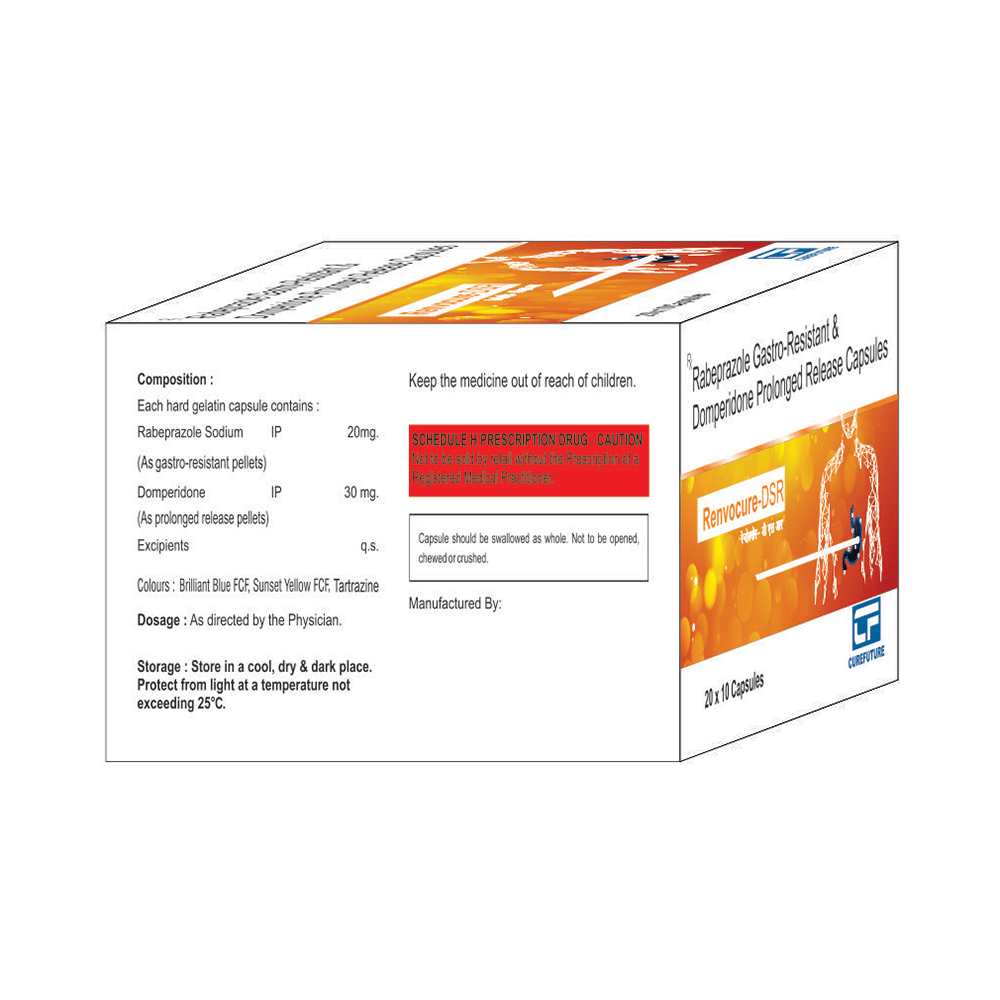Renvocure-DSR Capsule is a combination medicine used to treat gastroesophageal reflux disease (acid reflux). It works by relieving the symptoms of acidity such as heartburn, stomach pain, or irritation. It also neutralizes the acid and promotes easy passage of gas to reduce stomach discomfort. Renvocure-DSR Capsule is taken without food in a dose and duration as advised by the doctor. The dose you are given will depend on your condition and how you respond to the medicine. You should keep taking this medicine for as long as your doctor recommends. If you stop treatment too early your symptoms may come back and your condition may worsen. Let your healthcare team know about all other medications you are taking as some may affect, or be affected by this medicine.The most common side effects are diarrhea, stomach pain, dryness in the mouth, headache, flatulence, and weakness. Most of these are temporary and usually resolve with time. Contact your doctor straight away if you are at all concerned about any of these side effects. This medicine may cause dizziness and sleepiness, so do not drive or do anything that requires mental focus until you know how this medicine affects you. Avoid drinking alcohol while taking this medicine as it can worsen your sleepiness. Lifestyle modifications like having cold milk and avoiding hot tea, coffee, spicy food or chocolate can help you to get better results.Before you start taking this medicine it is important to inform your doctor if you are suffering from kidney or liver disease. You should also tell your doctor if you are pregnant, planning pregnancy or breastfeeding.