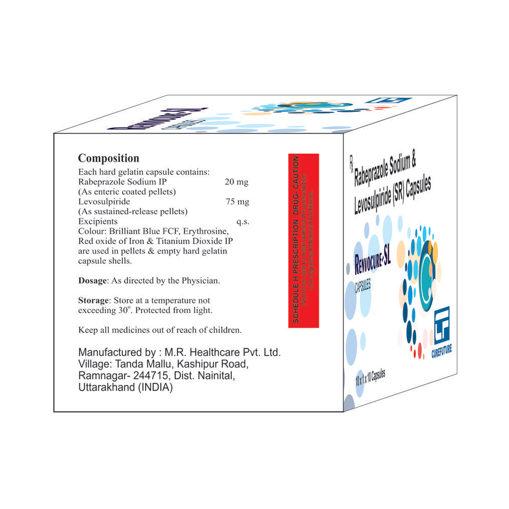 Renvocure-SL Capsule SR is a prescription medicine which is used in the treatment of gastroesophageal reflux disease (acid reflux), intestinal ulcers, and irritable bowel syndrome. It reduces excess acid production in the stomach and prevents the reflux of stomach acid into the food pipe. Renvocure-SL Capsule SR is taken with or without food in a dose and duration as advised by the doctor. The dose you are given will depend on your condition and how you respond to the medicine. You should keep taking this medicine for as long as your doctor recommends. If you stop treatment too early your symptoms may come back and your condition may worsen. Let your healthcare team know about all other medications you are taking as some may affect, or be affected by this medicine.The most common side effects are nausea, stomach pain, diarrhea, flatulence, constipation, headache, weakness, and flu-like symptoms. Most of these are temporary and usually resolve with time. Contact your doctor straight away if you are at all concerned about any of these side effects. It may also cause dizziness and sleepiness, so do not drive or do anything that requires mental focus until you know how this medicine affects you. Avoid drinking alcohol while taking this medicine as it can worsen your sleepiness.Lifestyle modifications like having fiber-rich diet, avoiding foods that trigger your symptoms, increasing fluid intake and regular exercise can help you to get better results. Before taking it, you should tell your doctor if you have any kidney or liver diseases. You should also tell your doctor if you are pregnant, planning pregnancy or breastfeeding.