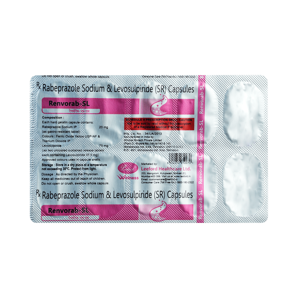 Renvorab-SL Capsule SR is a prescription medicine which is used in the treatment of gastroesophageal reflux disease (acid reflux), intestinal ulcers, and irritable bowel syndrome. It reduces excess acid production in the stomach and prevents the reflux of stomach acid into the food pipe. Renvorab-SL Capsule SR is taken with or without food in a dose and duration as advised by the doctor. The dose you are given will depend on your condition and how you respond to the medicine. You should keep taking this medicine for as long as your doctor recommends. If you stop treatment too early your symptoms may come back and your condition may worsen. Let your healthcare team know about all other medications you are taking as some may affect, or be affected by this medicine.The most common side effects are nausea, stomach pain, diarrhea, flatulence, constipation, headache, weakness, and flu-like symptoms. Most of these are temporary and usually resolve with time. Contact your doctor straight away if you are at all concerned about any of these side effects. It may also cause dizziness and sleepiness, so do not drive or do anything that requires mental focus until you know how this medicine affects you. Avoid drinking alcohol while taking this medicine as it can worsen your sleepiness.Lifestyle modifications like having fiber-rich diet, avoiding foods that trigger your symptoms, increasing fluid intake and regular exercise can help you to get better results. Before taking it, you should tell your doctor if you have any kidney or liver diseases. You should also tell your doctor if you are pregnant, planning pregnancy or breastfeeding.