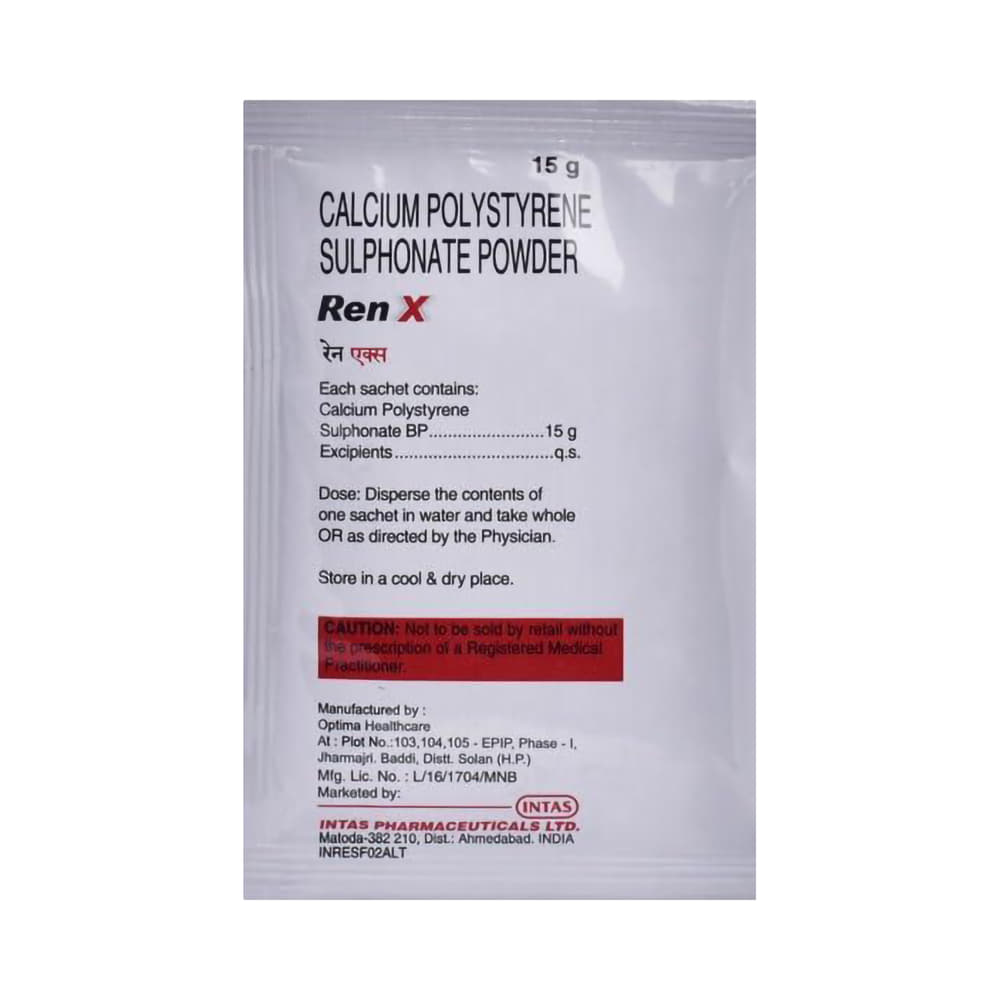 Renx 15gm Powder is an ion exchange resin. It works by removing extra potassium from your body and brings its levels back to normal. It is useful in patients who have kidney diseases and those on dialysis.