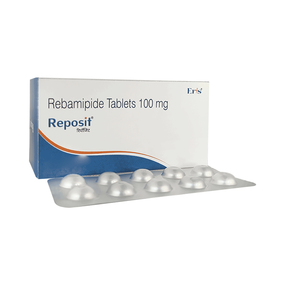 Reposit Tablet is a medicine used to treat stomach ulcers and gastritis. It increases protective mucus in the stomach, improves blood flow, and reduces inflammation. This helps heal damage caused by acid, irritation, or infection and relieves symptoms like pain, burning, and discomfort. Take Reposit Tablet exactly as prescribed by your doctor, usually once or twice daily. It can be taken with or without food. To get the most benefit, follow your doctor’s instructions carefully and take the medicine regularly without missing doses. In addition to taking Reposit Tablet, try to avoid spicy, oily, or acidic foods, limit alcohol intake, and manage stress, as these can irritate the stomach further. Quitting smoking, if you smoke, can also help improve your stomach health.Some people may experience mild side effects like nausea, constipation, diarrhea, or abdominal discomfort. These usually go away on their own as your body adjusts to the medicine. If the symptoms bother you or persist, talk to your doctor. Serious side effects are rare, but if you experience any unusual symptoms such as severe abdominal pain, allergic reactions, or rash, seek medical help immediately.Before starting Reposit Tablet, tell your doctor if you are pregnant, breastfeeding, or have any liver or kidney problems. Do not take this medicine if you are allergic to rebamipide or any of its ingredients. While on treatment, avoid overuse of painkillers like ibuprofen or aspirin, as they can irritate the stomach lining and slow down healing. Always inform your doctor about any other medications or supplements you are taking to avoid possible interactions.