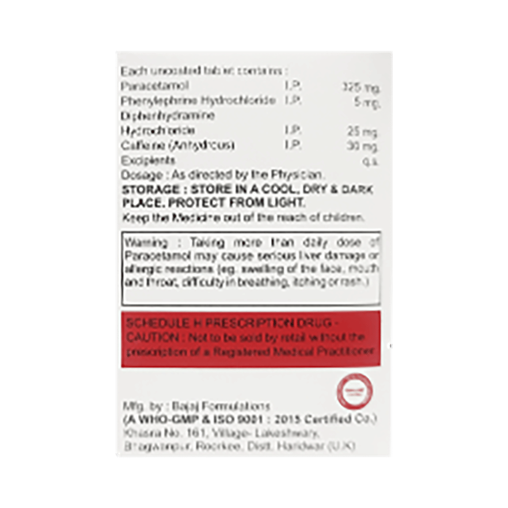 Salt Composition: Caffeine (30mg) + Diphenhydramine (25mg) + Paracetamol (325mg) + Phenylephrine (5mg)