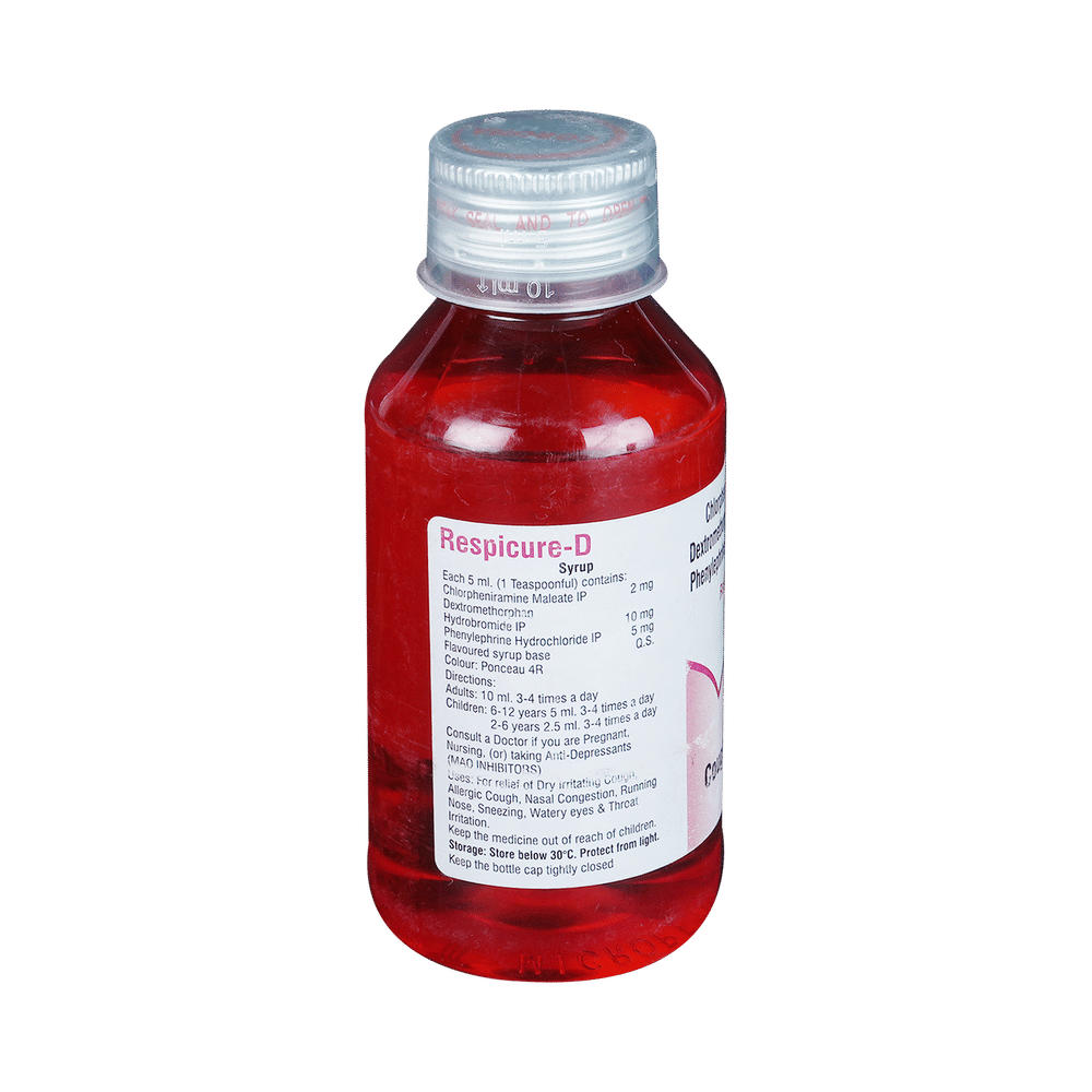 Respicure-D Syrup is a combination of three medicines: Phenylephrine, Chlorpheniramine Maleate, and Dextromethorphan Hydrobromide. Phenylephrine is a decongestant which narrows the small blood vessels providing relief from congestion or stuffiness in the nose. Chlorpheniramine Maleate is an antiallergic which relieves allergy symptoms like runny nose, watery eyes and sneezing. Dextromethorphan Hydrobromide is a cough suppressant which relieves cough by reducing the activity of cough center in the brain.
