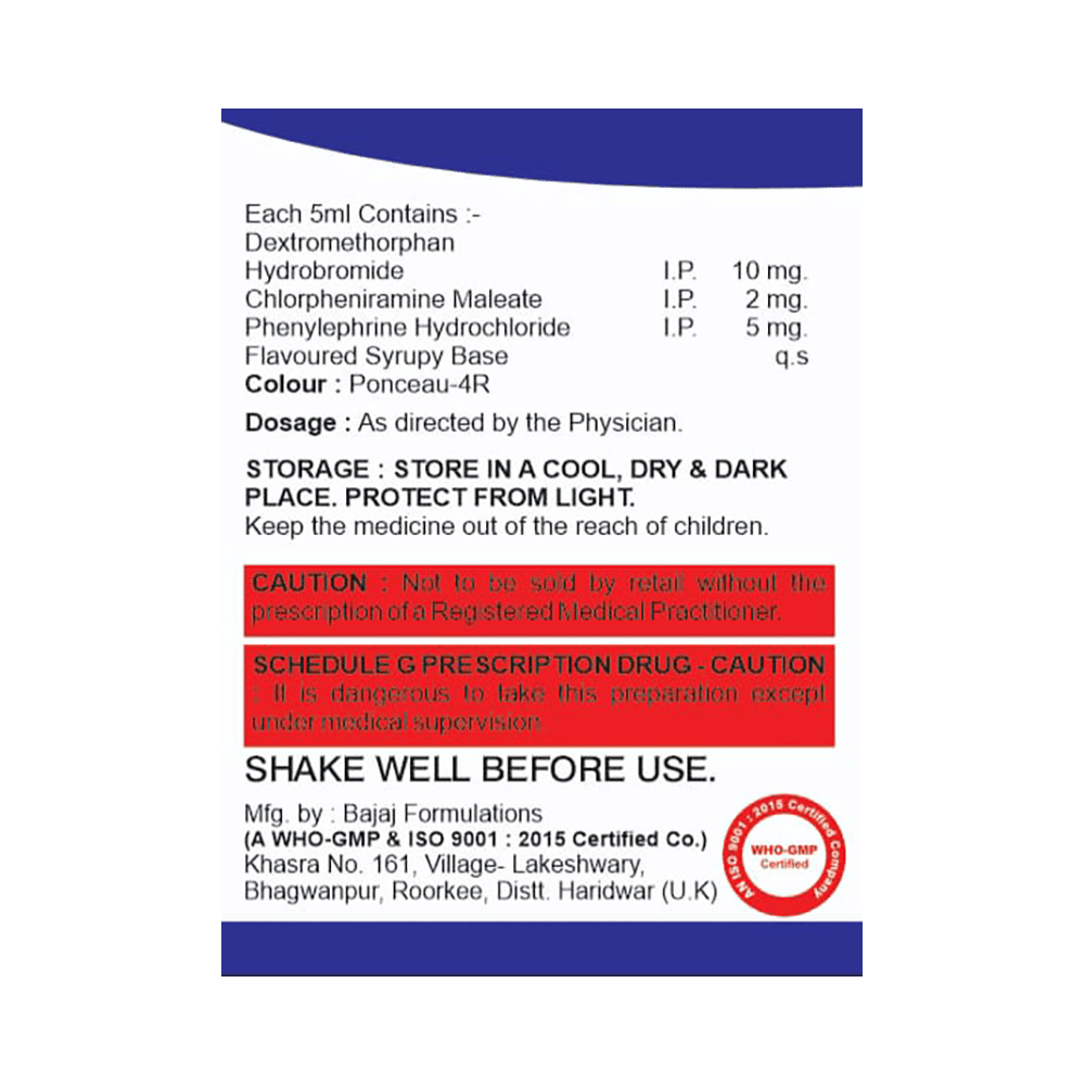 Salt Composition: Phenylephrine (5mg/5ml) + Chlorpheniramine Maleate (2mg/5ml) + Dextromethorphan Hydrobromide (10mg/5ml)