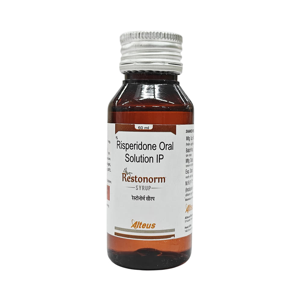 Restonorm 1mg Syrup is used in the treatment of schizophrenia (a mental disorder that can result in hallucinations or delusions and also adversely affects a person’s ability to think and behave) and mania. Restonorm 1mg Syrup is taken with or without food, preferably at night. However, it is advised to take it at the same time each day as this helps to maintain a consistent level of medicine in the body. Take this in the dose and duration as advised by your doctor and if you have missed a dose, take it as soon as you remember. It is important that this medication is not stopped suddenly without talking to your doctor as it may worsen your symptoms. However, discontinue this medicine immediately if you experience Neuroleptic malignant syndrome (NMS), characterized by fever, muscle rigidity, and altered consciousness or seizures.Some common side effects of this medicine include insomnia, sedation, somnolence, vomiting, coughing, parkinsonism, headache, and fever. Initially, this medicine may cause a sudden drop in blood pressure when you change positions, so it is better to rise slowly if you have been sitting or lying down. It also causes dizziness and sleepiness, so do not drive or do anything that requires mental focus until you know how this medicine affects you. This medicine may increase your weight but, modifying your lifestyle by having a healthy diet and exercising regularly can reduce this side effect.You should be cautious while using this medicine as it may increase the risk of developing diabetes, so it is better to monitor glucose regularly. Inform your doctor if you develop any unusual changes in mood or behavior, new or worsening depression, or suicidal thoughts while taking this medicine.