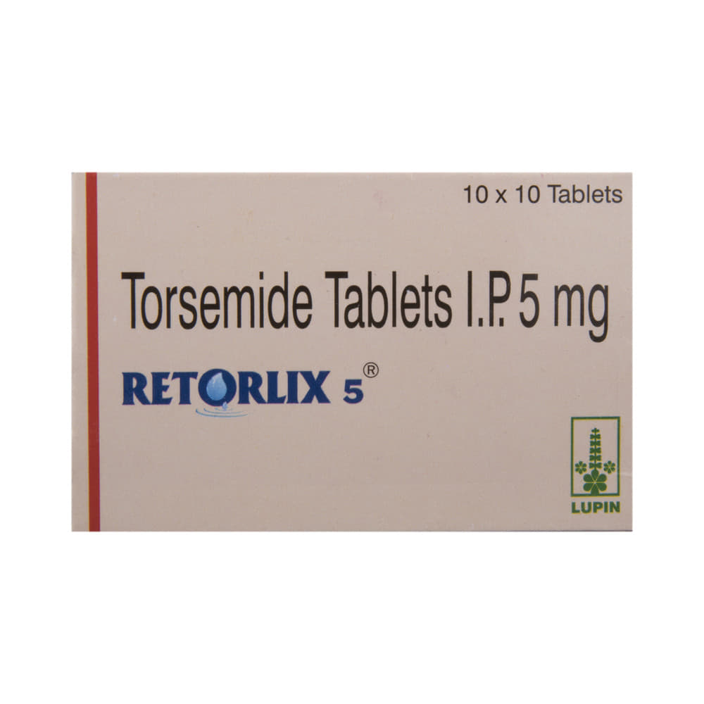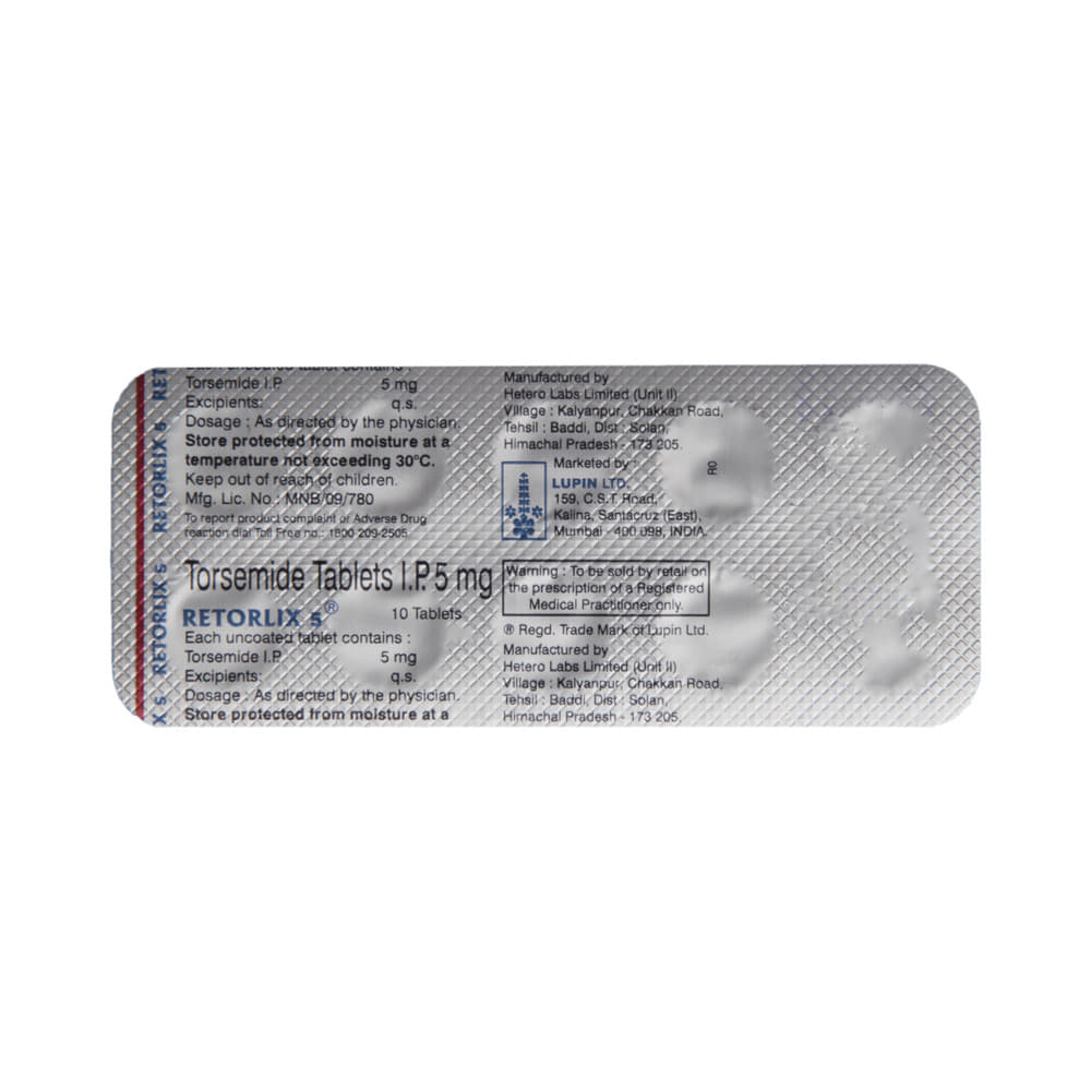 Retorlix 5 Tablet belongs to a group of medicines called diuretics or water tablets. It is used to reduce the swelling (edema) caused by too much water in the body in people who have heart failure, liver disease, or kidney disease. This medicine is also used to treat high blood pressure. Retorlix 5 Tablet helps your body get rid of extra water and salt through urine. It may be used alone or in combination with other medicines as per the dose advised by your doctor. It can be taken with or without food and should be taken at the same time each day. It is best to avoid taking this medicine within 4 hours of your bedtime to prevent having to get up at night to urinate.It is important to continue taking this medication even if you feel well. If you stop taking it without consulting your doctor, your condition may worsen. Lifestyle changes like reducing stress, restricting salt intake, and stopping smoking may help this medication work better.Common side effects of this medicine include headache, dizziness, dehydration, decreased blood pressure, and stomach upset. These are usually mild and disappear after a short time. Consult your doctor if they bother you or do not go away.Before taking this medicine, let your doctor know if you have any liver problems. Pregnant or breastfeeding women should also consult their doctor before taking it. Regular monitoring of kidney function and electrolyte levels is important while using this medicine. It may reduce the potassium level in your blood so your doctor may ask you to add potassium-rich foods to your diet (such as bananas, coconut water, etc.) or prescribe supplements.