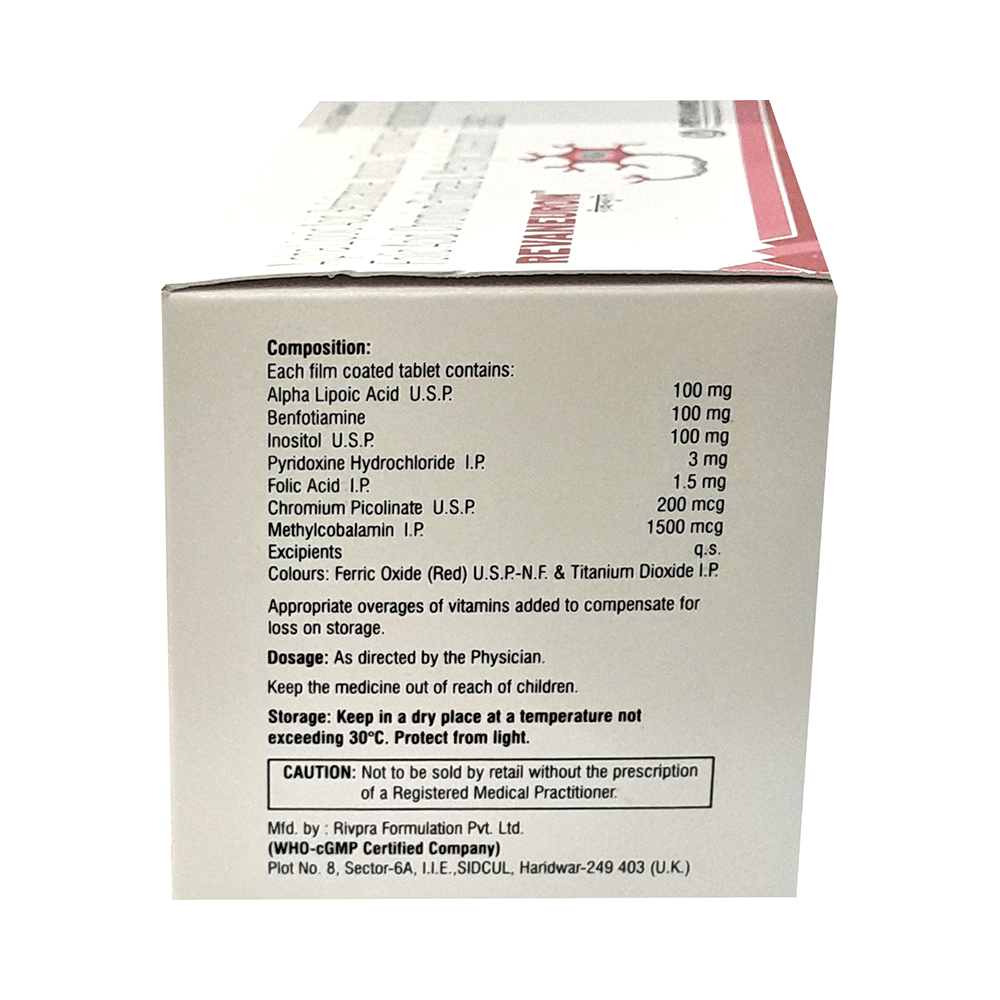 Revaneuron Tablet is a combination of vitamin and mineral supplements. Alpha-lipoic acid is an antioxidant that protects the brain and nerves from harmful free radicals. It also lowers “bad” cholesterol and breaks down carbohydrates to make energy. Benfotiamine treats vitamin B1 deficiency and the nerve damage caused by this deficiency. Chromium picolinate reduces insulin resistance and the risk of cardiovascular disease and type 2 diabetes. Folic acid is essential for the production of red blood cells. It prevents and treats folate deficiency and anemia. Methylcobalamin corrects vitamin B12 deficiency, thereby helping in treating certain anemias and nerve problems. Myo-inositol is an insulin-sensitizing agent that decreases insulin resistance. Pyridoxine treats or prevents vitamin B6 deficiency and improves the functioning of the nervous and immune systems.