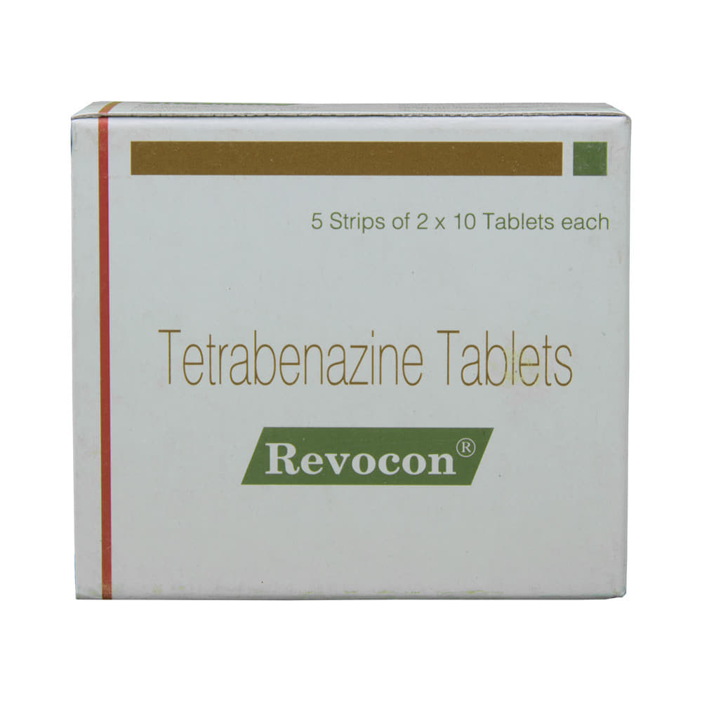 Revocon Tablet is used to treat chorea (which is a movement disorder characterized by involuntary, jerky movements) associated with Huntington's disease. It reduces movements and improves function. This makes it easier for the person to move and function better. Revocon Tablet should be taken with or without food. However, it is advised to take it at the same time each day, as this helps maintain a consistent level of medicine in the body. Take this in the dose and duration as advised by your doctor. This medication must not be stopped suddenly without talking to your doctor, as it may worsen your symptoms.Some common side effects of this medicine include nausea, insomnia (difficulty sleeping), anxiety, fatigue, akathisia (restlessness and inability to stay still), and depression. It also causes dizziness and sleepiness, so do not drive or do anything that requires mental focus until you know how this medicine affects you. Inform your doctor if you develop any unusual changes in mood or behavior, new or worsening depression, or suicidal thoughts while taking this medicine.Stop taking this medicine immediately if you have a fever, stiff muscles, confusion, or seizures (signs of neuroleptic malignant syndrome). Let your doctor know if you have any medical conditions. Let your doctor also know about all the medications you are taking, as some medicines may interact with Revocon Tablet. Pregnant or breastfeeding women should consult their doctor before taking Revocon Tablet to ensure safety.